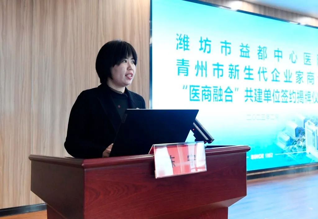 陈宁会长代表青州市卫健系统为大会致辞:医商融合共建活动的开展,是响应市委市政府优化营商环境、服务“两个健康”的具体举措。此项活动既有益于卫生健康事业的高质量发展,也有益于促进企业家的身心健康,进而促进企业的健康发展。通过医商融合共建活动,医院将为广大新生代企业家提供更加优质、更为便捷、更有温度的医疗服务和保障,依托双方资源,加强交流互动,实现“1+1>2”的共建效果,助力企业实现高质量发展新突破,开创千年古城新崛起新局面,并衷心祝愿医商融合共建活动能够取得丰硕成果!