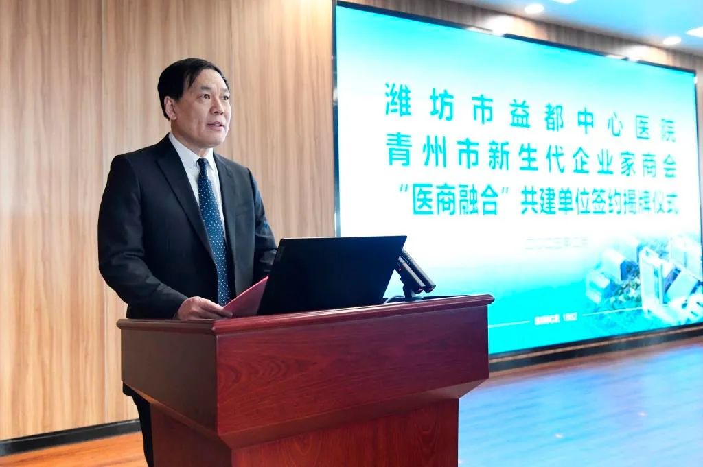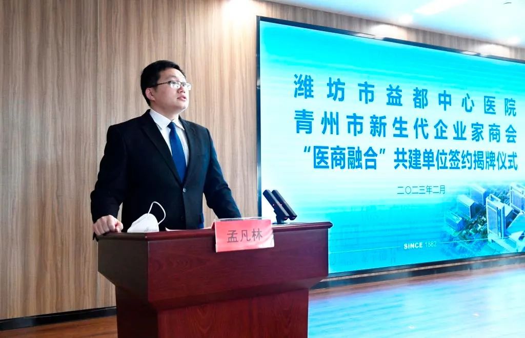 孟凡林书记对“医商融合”共建活动提出了希望和要求:今年是全面贯彻落实党的二十大精神的开局之年,是潍坊市确定的“商会组织建设年”,也是我市全面推进千年古城新崛起,实现高质量发展突破的关键一年。对工商联和商会来说,既面临着前所未有的发展机遇,也对我们基层商会的各项工作提出了更高的要求和挑战。围绕发挥桥梁纽带作用,努力做好政府的助手、企业的帮手、行业的推手,新生代企业家商会率先响应市委、市政府号召,积极融入经济社会发展大局,广泛联系资源,找准切入点,开展共建活动,体现了年轻一代企业家的使命担当。益都中心医院作为我市服务群众健康的标杆单位,有良好的医疗水平和群众口碑,与中心医院的合作有利于实现强强联合、优势互补,促进共同发展。组织开展“医商融合” 共建活动,是实质性促进“两个健康”,持续优化营商环境的重要举措,也是更好地服务医商双方携手发展的有效抓手。希望双方借助此次融合共建的合作机遇,不断拓展合作广度和深度,切实把活动做到实处、做出特色,打造医商融合共建的典型示范和有效路径,实现携手共赢,更好助力青州经济社会发展进步。