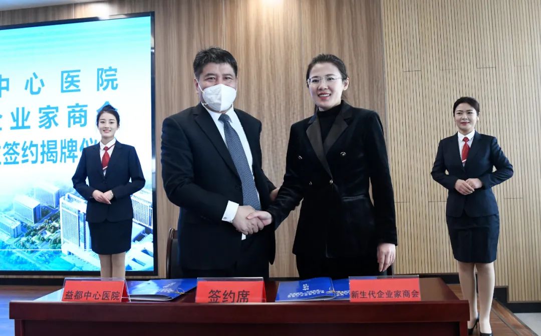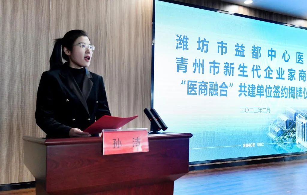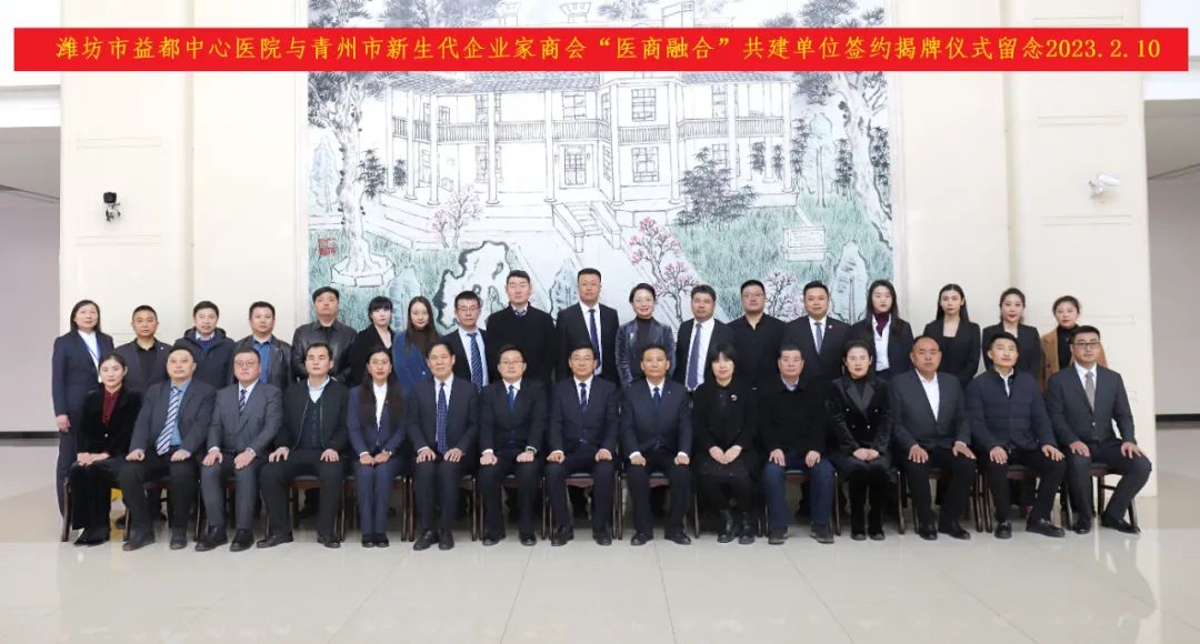 2023年2月10日,青州市新生代企业家商会与潍坊市益都中心医院在潍坊市益都中心医院隆重举行“医商融合”共建单位签约揭牌仪式。市人大常委会党组成员、副主任,市工商联主席刘学军;青州市人大常委会副主任、医院党委书记蔡治清;市委统战部副部长,市工商联党组书记、常务副主席,市非公有制企业党委书记孟凡林;青州市计生协会会长陈宁;青州市新生代企业家商会第一书记崔广明;青州市非公有制企业党委副书记刘俊伟等领导出席会议。潍坊市益都中心医院党委副书记、院长方军,潍坊市益都中心医院副院长丁玉峰等领导班子及行管、医技科室的负责人,青州市新生代企业家商会党支部书记、会长孙洁,副会长赵远涛、孙健、王迎亚、潘广寻、刘斐、陈倩倩,秘书长兰丽伟,以及部分理事、会员代表参加会议。