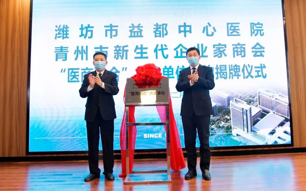 第二阶段举行“医商融合”共建单位签约揭牌仪式。会议由潍坊市益都中心医院党委副书记、院长方军主持,共分六项议程。一是观看潍坊市益都中心医院宣传片;二是青州市计生协会会长陈宁为揭牌仪式致辞;三是青州市新生代企业家商会党支部书记、会长孙洁讲话;四是市工商联党组书记、常务副主席,市非公有制企业党委书记孟凡林讲话;五是潍坊市益都中心医院副院长丁玉峰与青州市新生代企业家商会党支部书记、会长孙洁代表双方单位签约。六是市人大常委会党组成员、副主任,市工商联主席刘学军与青州市人大常委会副主任、医院党委书记蔡治清为“医商融合”共建单位揭牌。