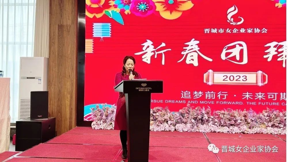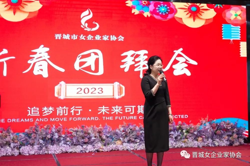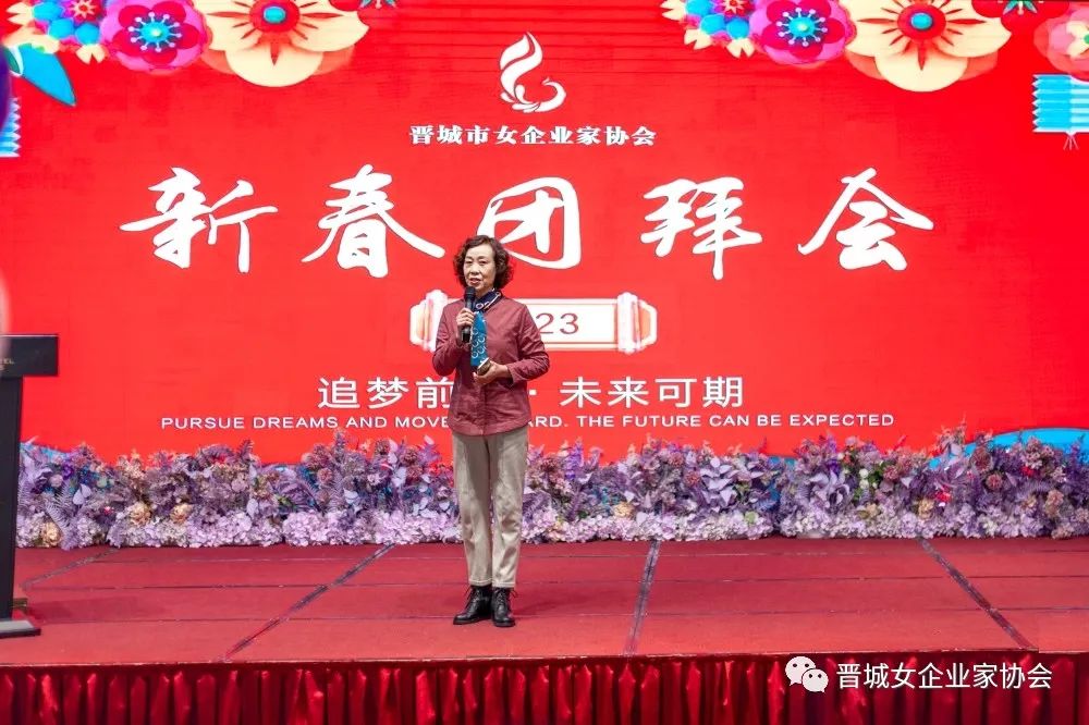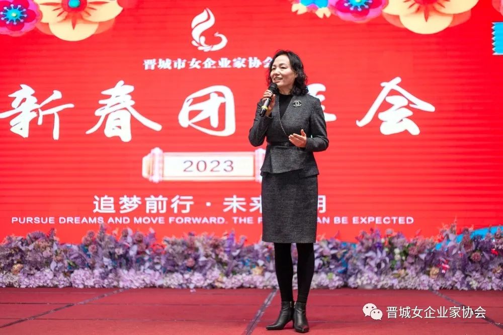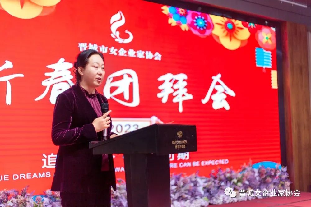 会长王青俊致新春贺词,王会长为姐妹们送上节日的祝福,并回顾总结协会过去一年的工作开展情况,对今年的工作重点进行安排部署:一是要密切联系会员,解决实际困难;二是引导会员用只争朝夕的精神,弥补疫情三年的损失;三是要坚持“走出去”,学习先进经验,做到创新发展。她鼓励所有会员姐妹们要继续坚定信心、团结携手,勇敢面对新形势,主动拥抱新变化,积极展现新作为,努力做大做强自己的企业,为经济社会发展贡献更多力量。