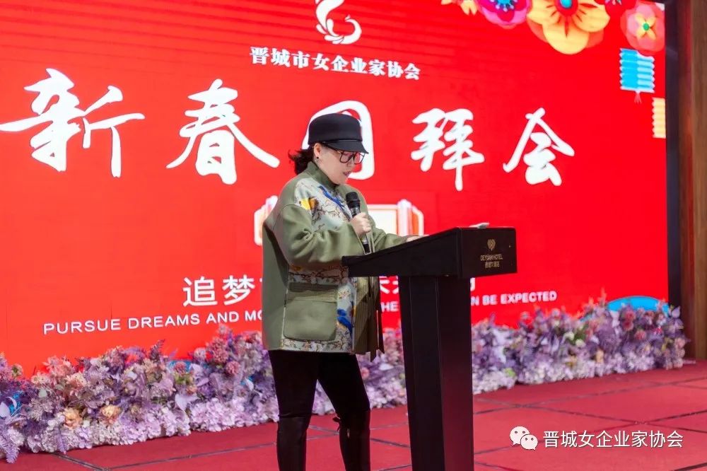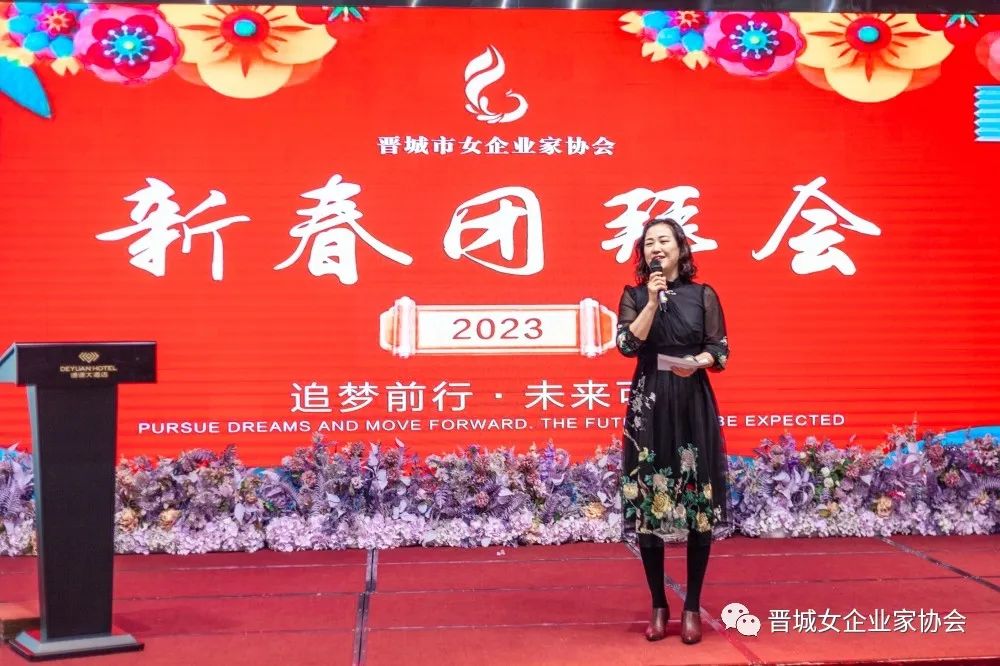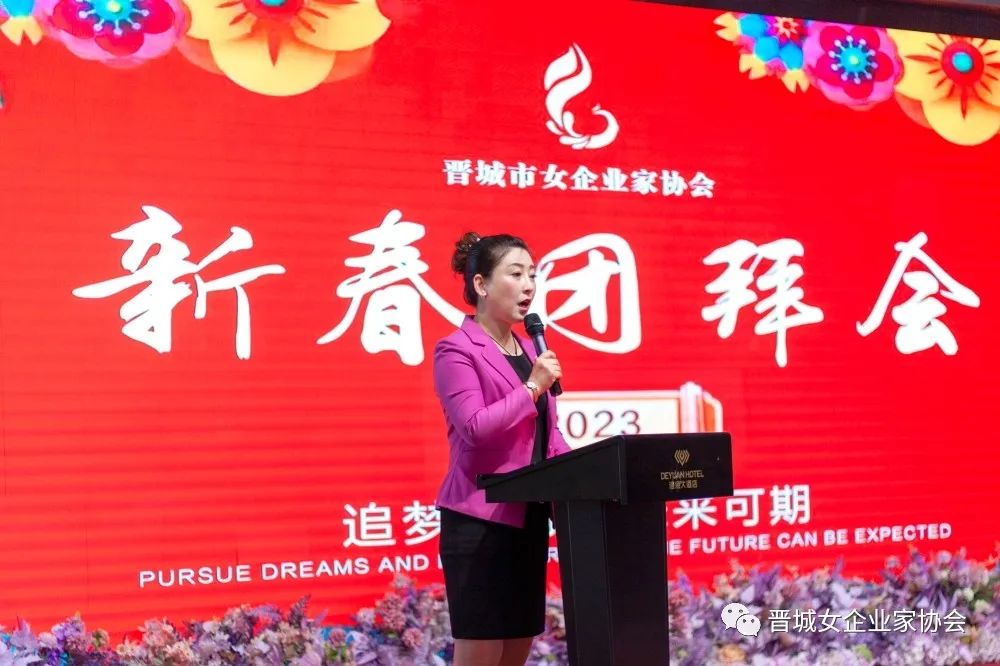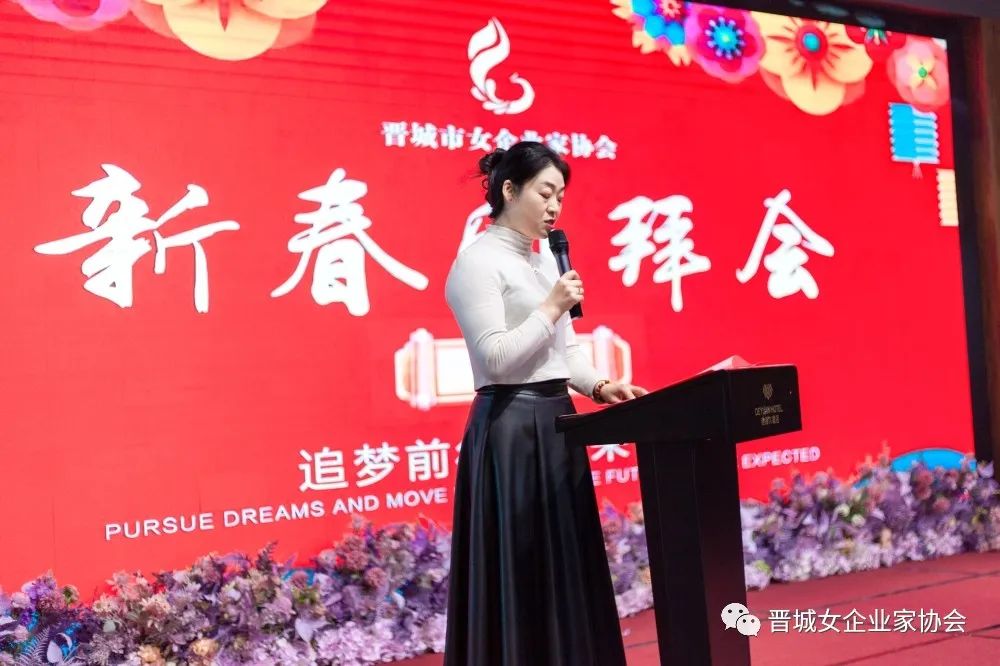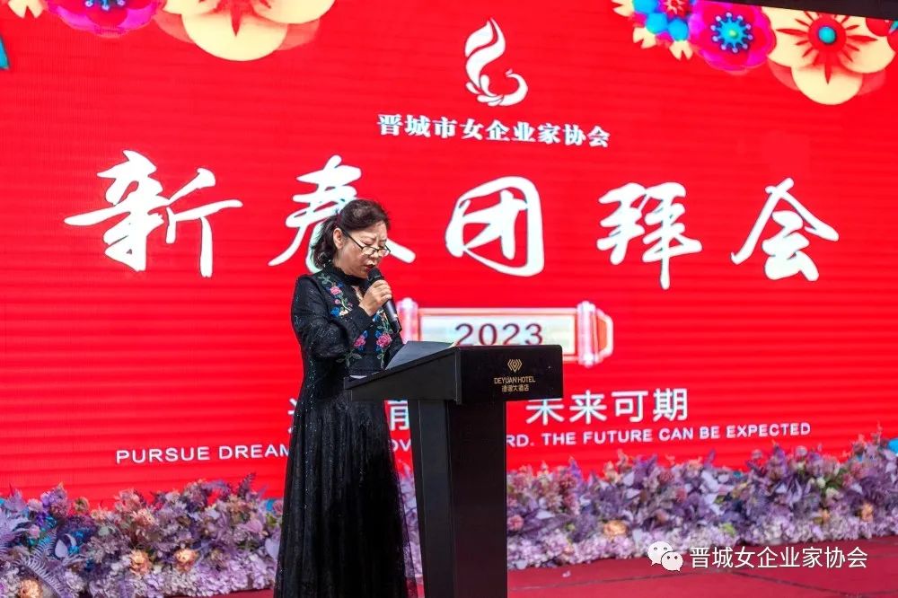 会长王青俊致新春贺词,王会长为姐妹们送上节日的祝福,并回顾总结协会过去一年的工作开展情况,对今年的工作重点进行安排部署:一是要密切联系会员,解决实际困难;二是引导会员用只争朝夕的精神,弥补疫情三年的损失;三是要坚持“走出去”,学习先进经验,做到创新发展。她鼓励所有会员姐妹们要继续坚定信心、团结携手,勇敢面对新形势,主动拥抱新变化,积极展现新作为,努力做大做强自己的企业,为经济社会发展贡献更多力量。