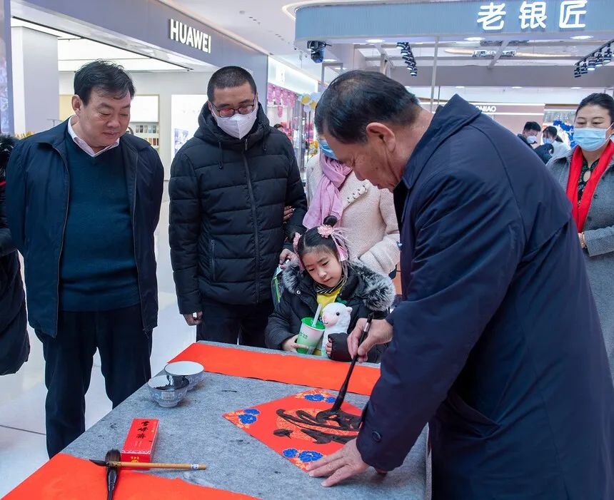 酒业联盟理事长、高密市美术家协会主席单百平现场写福字赠与市民朋友。