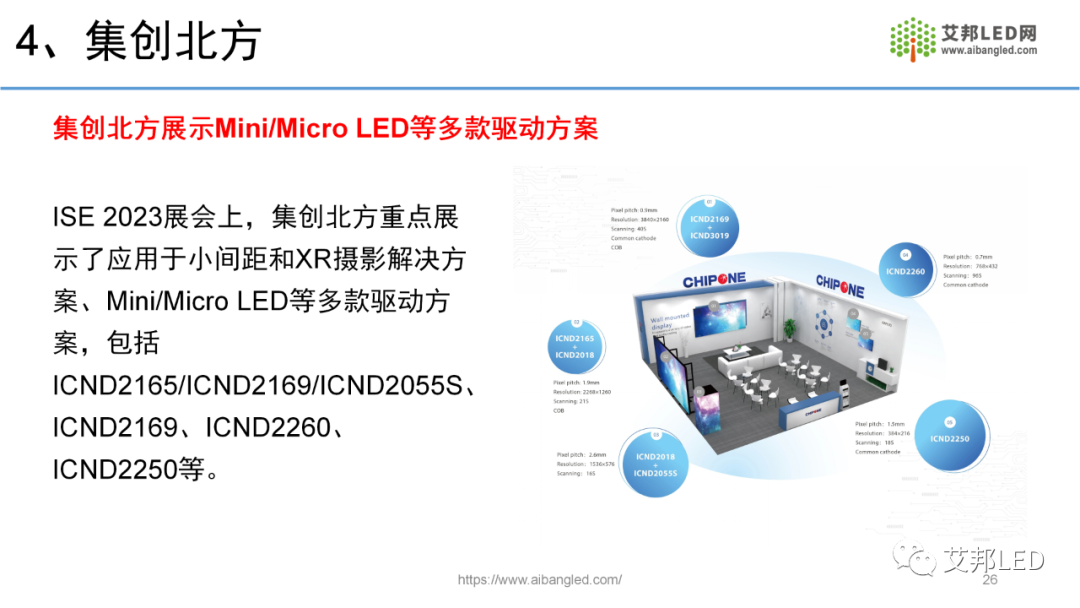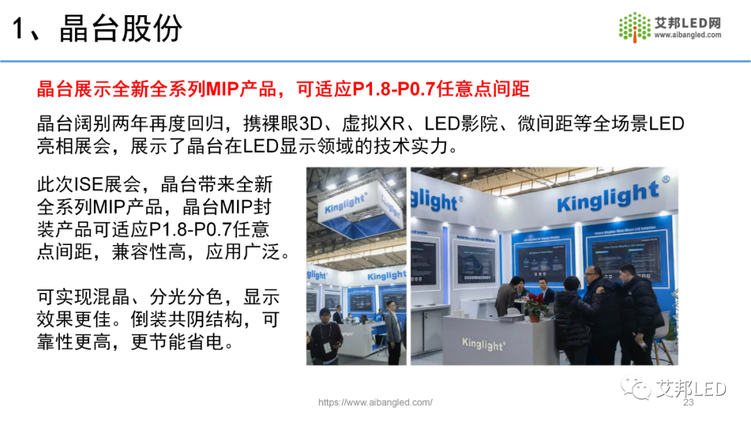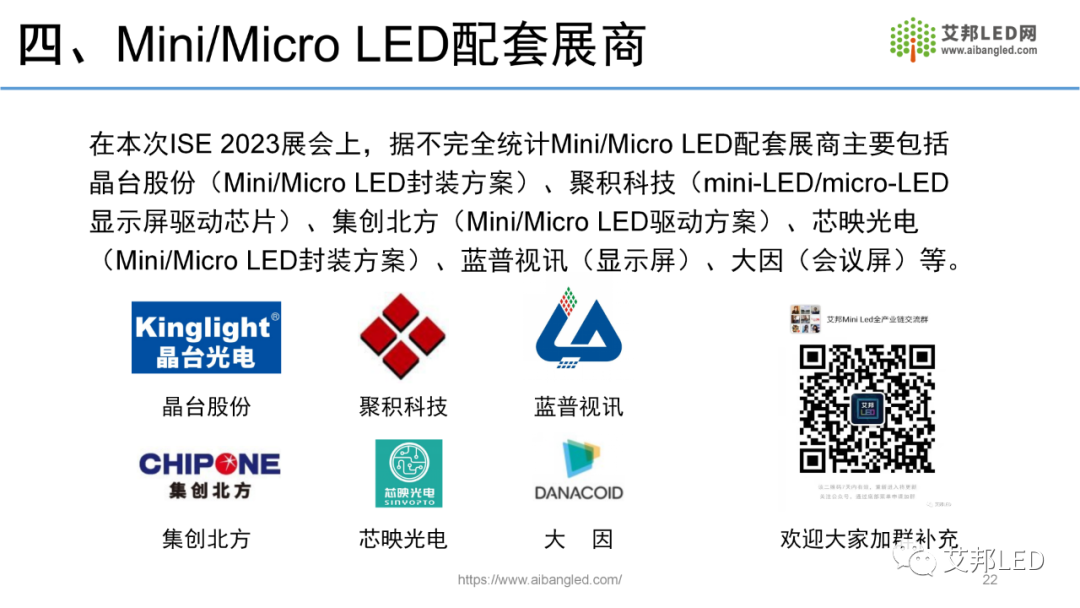 在本次ISE 2023展会上,据不完全统计Mini/Micro LED配套展商主要包括晶台股份(Mini/Micro LED封装方案)、聚积科技(mini-LED/micro-LED显示屏驱动芯片)、集创北方(Mini/Micro LED驱动方案)、芯映光电(Mini/Micro LED封装方案)、蓝普视讯(显示屏)、大因(会议屏)等。