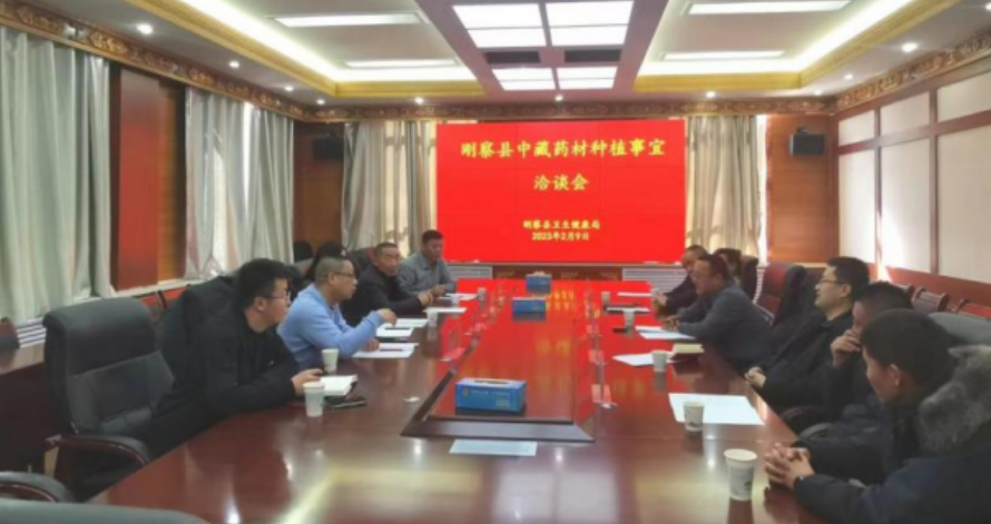 考察组以洽谈会的形式与县卫生健康局、自然资源与林业草原局、黄玉农垦有限责任公司相关负责同志就此行目的、大规模种植中藏药采种植前景、中药材种植气候条件以及大规模产成后所带来的经济效益等情况进行洽谈。