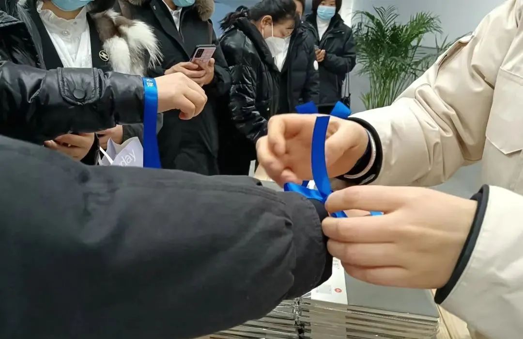 区域经理为团队成员系上蓝丝带,寓意大家上下一心、团结协作。