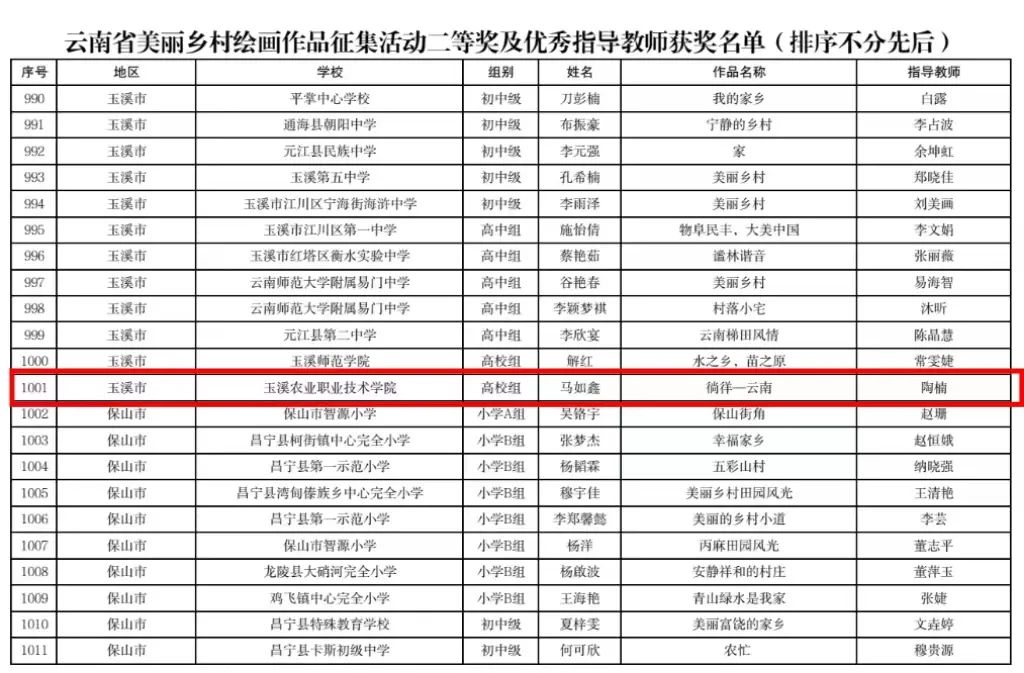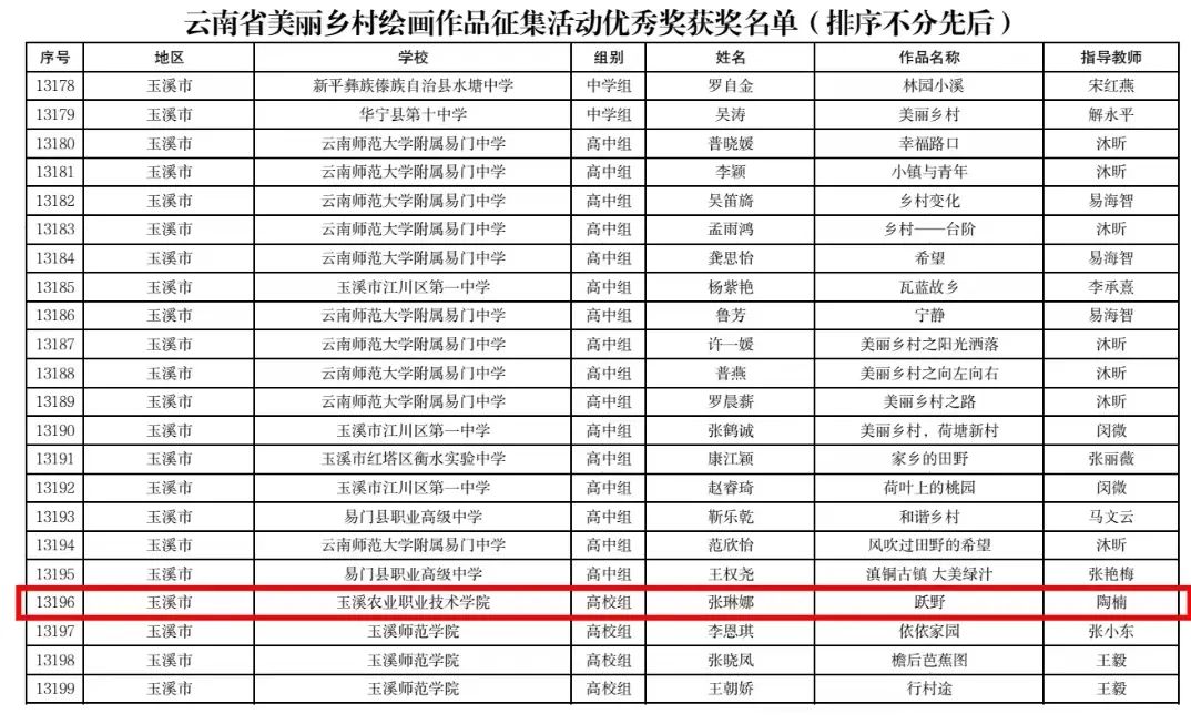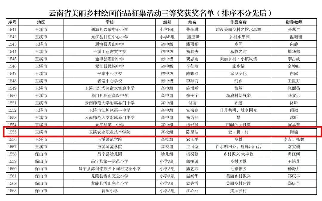 近期,在省农业农村厅、省教育厅、省精神文明建设指导委员会办公室、省乡村振兴局组织开展的“云南省美丽乡村绘画作品征集活动”中,玉溪农业职业技术学院共有4位同学的绘画作品在此次活动中荣获佳绩,指导老师均为建筑与工程学院陶楠老师。其中马如鑫同学作品《徜徉—云南》获二等奖,陈星洁同学作品《云.耕.村》获三等奖,张琳娜同学作品《跃野》和谢赵羽同学作品《希望在田野跳跃》分获优秀奖。