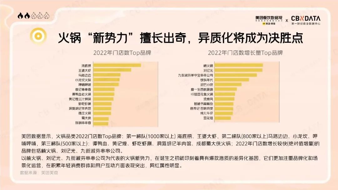 根据美团最新发布的《2022年火锅品类发展报告》,在2022年火锅门店数量排行榜上,小龙坎排名第四,蜀大侠排名第十一,两者皆为当下火锅赛道的腰部王者品牌。