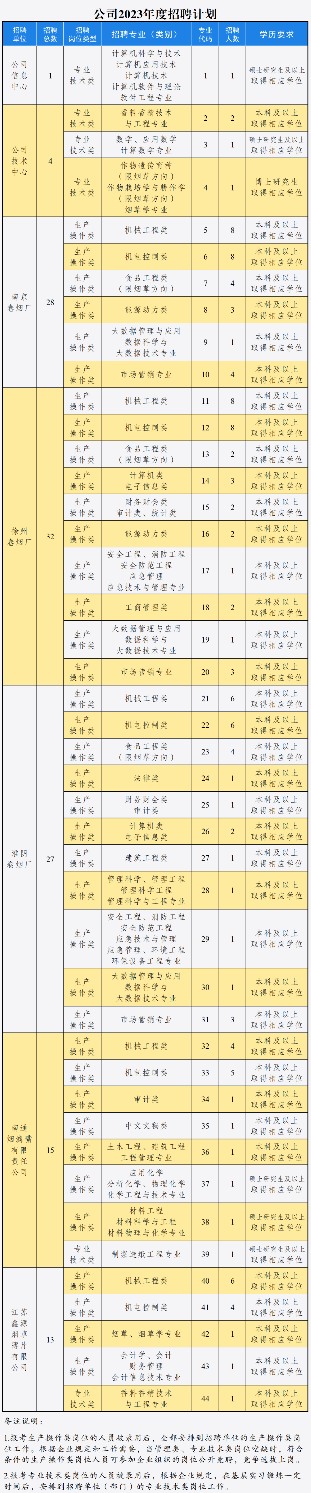 江苏中烟工业有限责任公司(以下简称公司)是中国烟草总公司的全资子公司。现下辖南京卷烟厂、徐州卷烟厂、淮阴卷烟厂3家不具有法人资格的卷烟生产企业和南通烟滤嘴有限责任公司、江苏鑫源烟草薄片有限公司2家全资子公司。根据发展需要,公开招聘高校毕业生。现将有关事项公告如下:2023年度,公司将考试录用高校毕业生120人,其中,公司信息中心1人,公司技术中心4人,南京卷烟厂28人,徐州卷烟厂32人,淮阴卷烟厂27人,南通烟滤嘴有限责任公司15人,江苏鑫源烟草薄片有限公司13人。招聘岗位类型为生产操作类和专业技术类两种,其中,生产操作类岗位113人,专业技术类岗位7人。具体情况见《公司2023年度招聘计划》(附件1)。报考生产操作类岗位的人员被录用后,全部安排到招聘单位的生产操作类岗位工作。根据企业规定和工作需要,当管理类、专业技术类岗位空缺时,符合条件的生产操作类岗位人员可参加企业组织的岗位公开竞聘,竞争选拔上岗。报考专业技术类岗位的人员被录用后,根据企业规定,在基层实习锻炼一定时间后,安排到招聘单位(部门)的专业技术类岗位工作。2023年1月1日至2023年12月31日期间毕业、并取得相应学历学位证书的全国普通高校毕业生,2022年9月1日至2023年8月31日期间毕业,并能在2023年12月31日前完成教育部留学服务中心学历学位认证且尚未就业的留学回国人员。2.拥护中华人民共和国宪法,拥护中国共产党领导和社会主义制度;4.具备岗位所需的专业、学历、学位要求(见附件1),能按照招聘要求提供相关材料;5.具有正常履行职责的身体条件和心理素质,无职业禁忌症、适应企业工作。本次招聘报名和资格初审通过网络进行,不接受现场报名。报名方式:请登录http://zkfw.91job.org.cn/进行报名(唯一报名通道)。应聘者根据本人专业、学历、学位情况和个人意愿,只能从招聘计划中选择一个招聘单位(部门)的一个符合招聘条件的专业职位报名。技术咨询电话:025—66049069,咨询时间:报名期内工作日9:00—11:30、14:00—16:30。(仅提供报名网站技术问题咨询,其他事宜谢绝来电)报名时间:2023年2月13日9:00至2023年3月14日17:00,逾期报名通道关闭,不再受理。资格初审时间:2023年2月13日9:00至2023年3月16日12:00。陈述申辩时间:2023年3月6日9:00至2023年3月16日16:00。异议处理时间:2023年3月8日9:00至2023年3月20日16:00。资格审查贯穿招聘工作的全过程。在招聘各环节发现应聘者不符合招聘对象及条件要求的,取消其报考或录用资格。应聘者通过唯一网上报名通道提交报名信息后,在资格初审期内,可在报名网站查询资格初审结果。通过资格初审的,不得再报考其他专业职位;未通过资格初审的,审查单位应说明理由,应聘者可在陈述申辩期内通过网络向审查单位陈述申辩。审查单位应当听取其陈述申辩,对其提出的事实、理由和证据进行审查,在异议处理期内作出审查结论并告知审查结果;对填报、提交材料不全或需应聘者补充说明的,审查单位应注明缺失或需说明的内容,要求应聘者及时补充。未通过资格初审的应聘者,在报名期内可以改报其他专业职位,超过报名期的不能改报。公司信息中心、技术中心jszx_cssb@163.com;南通烟滤嘴有限责任公司nt_cssb@163.com;江苏鑫源烟草薄片有限公司xygs_cssb@163.com。招聘专业类别划分及审查依据为《江苏省2023年度考试录用公务员专业参考目录》(附件2)。江苏省公务员专业参考目录中未涉及的专业,以国家教育部门颁布的专业目录或以江苏省教育部门出具的建议为依据。笔试开考比例原则上为1:3。对于公司发展需求量较大的“机电控制类”“机械工程类”招聘专业,以及难以形成充分竞争的专业技术类岗位招聘专业,报名结束后,有效报名人数大于招聘人数、形成竞争关系的,可以正常开考;有效报名人数小于或等于招聘人数、未形成竞争关系的,按照程序核减招聘计划,直至形成竞争关系或者取消该专业职位。其他专业职位招聘人数与有效报名人数之比未达到1:3的,按照程序核减招聘计划,直至达到开考比例或者取消该专业职位。核减或取消招聘计划的,在原发布招聘公告的媒体上发布招聘计划变更公告。报考被取消专业职位并通过资格初审的,可在报名网站重新补报其他符合条件的专业职位,补报名时间另行通知。(1)应聘者应按照网上报名系统要求,如实、准确、完整地填写个人有关信息,提交申请材料。申请材料应当真实准确、完整有效、清晰规范,包括证件照、成绩单、就业推荐表等材料。提供虚假报考信息和材料的,一经查实,即取消其报考资格。(2)因犯罪受过刑事处罚的人员、被开除中国共产党党籍的人员、被开除公职的人员、被依法列为失信联合惩戒对象的人员、在国家法定考试中被认定有舞弊等严重违反录用纪律行为的人员、因涉嫌违纪违法正在接受审查的人员,不得报考。(3)应聘者不得报考录用后即构成干部任职回避情形的岗位,也不得报考与本人有夫妻关系、直系血亲关系(包括祖父母、外祖父母、父母、子女、孙子女、外孙子女)、三代以内旁系血亲关系(包括伯叔姑舅姨、兄弟姐妹、堂兄弟姐妹、表兄弟姐妹、侄子女、甥子女)以及近姻亲关系(包括配偶的父母、配偶的兄弟姐妹及其配偶、子女的配偶及子女配偶的父母、三代以内旁系血亲的配偶)的人员担任领导成员的用人单位的岗位。应聘者存在不得