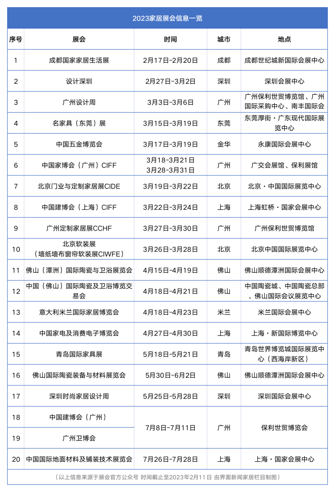 其中有5个展会在广州,3个展会在上海,3个展会(陶瓷)在佛山,2个展会在北京,其余办展的城市还有成都、深圳、东莞、金华、青岛。