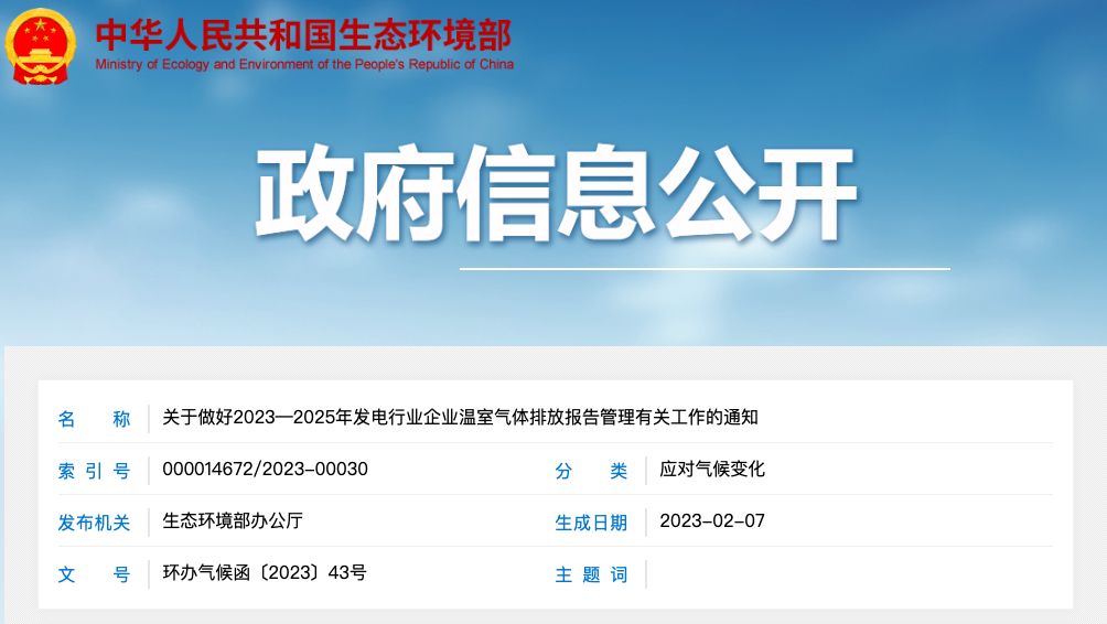 2月7日,生态环境部发布关于做好2023—2025年发电行业企业温室气体排放报告管理有关工作的通知,通知指出: