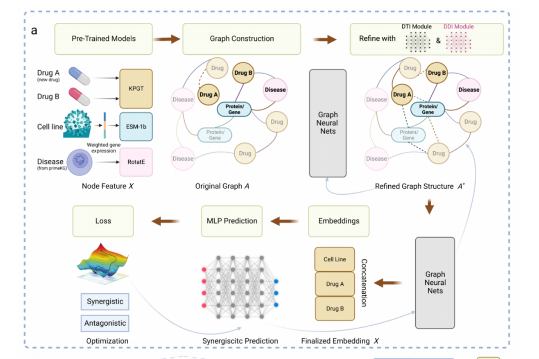 为了解决上述问题,在这项研究中,团队提出一个端到端的深度学习框架,通过利用多模态数据、图神经网络和大规模无监督训练,提取和整合了药物协同作用的重要特征,从而准确地预测协同效应。