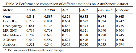 更进一步的,表3则总结了上述7种方法在行业公认的阿斯利康(AZ)数据集上迁移测试的表现。这一数据集基于专门评估药物协同预测的赛事“AstraZeneca-Sanger Drug Combination Prediction DREAM Challenge",由阿斯利康、桑格研究所、Sage Bionetworks-DREAM Challenge组委会共同推出。