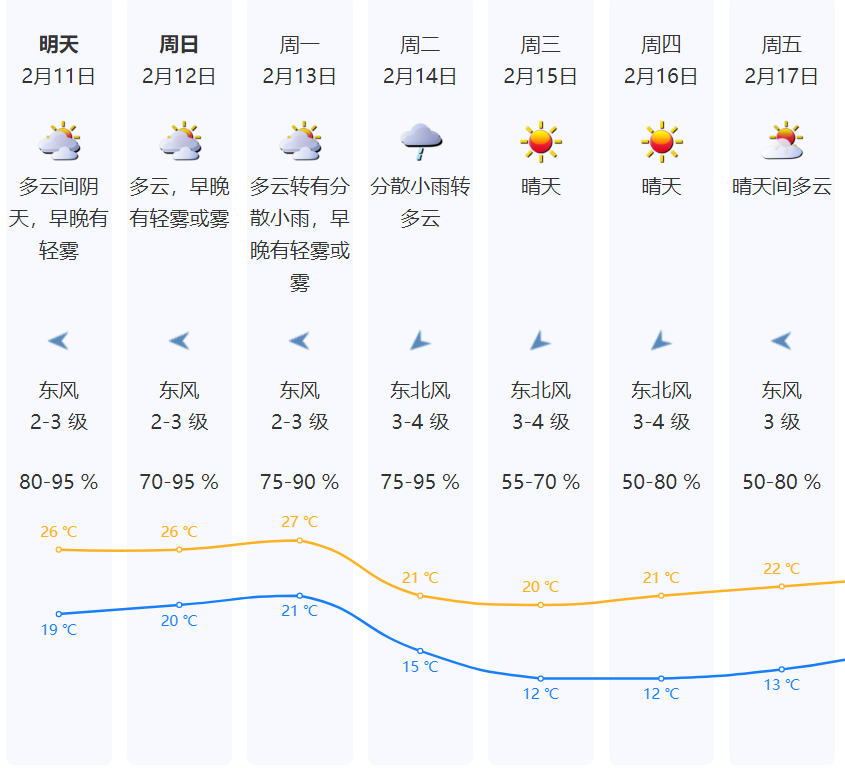 2月12日,多云到晴天,早晚有(轻)雾和零星小雨;气温19-26℃;东南风3级,沿海、高地和海区阵风5-6级;相对湿度65%-95%。