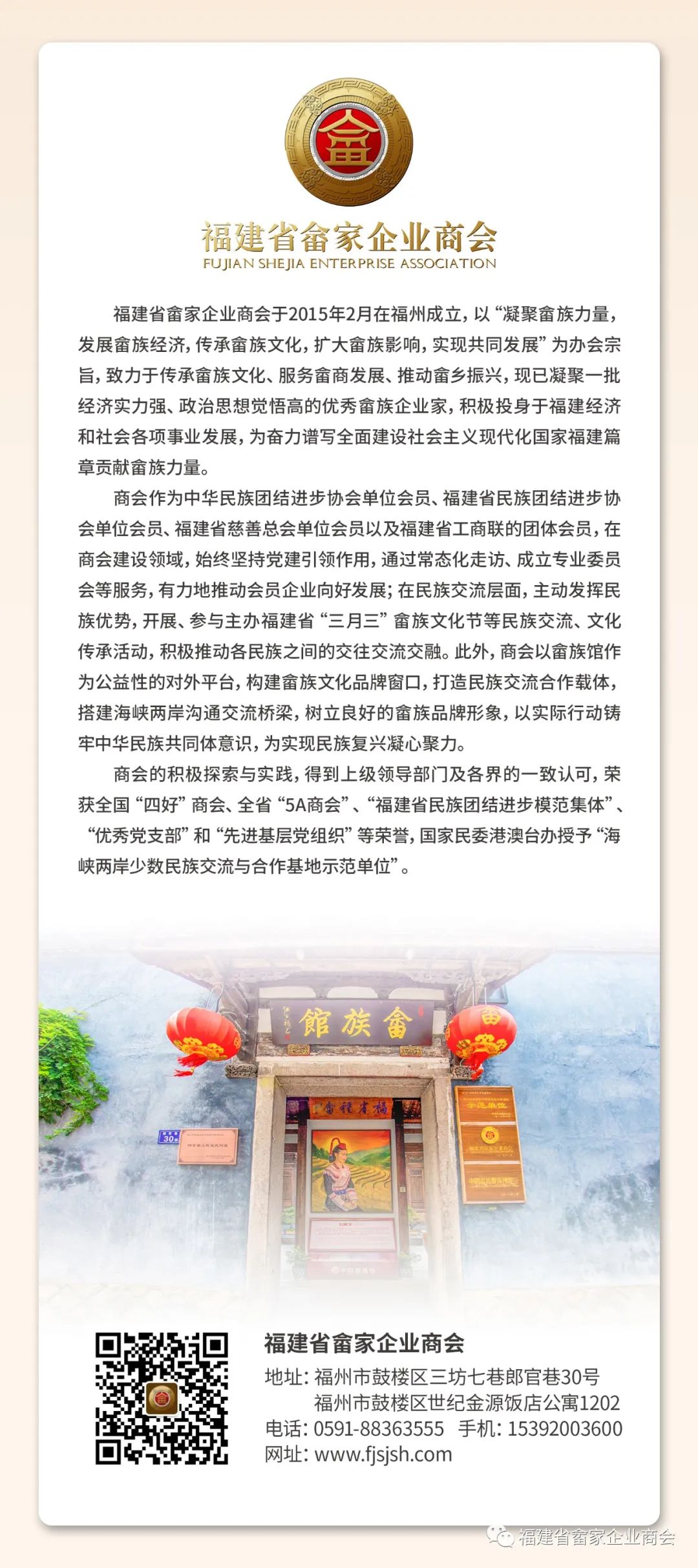自福建省畲家企业商会成立以来,始终秉承闽商精神和畲族优良传统,一直致力于联络全省各地的畲族同胞和畲族企业家,广泛凝聚全省畲族人民的智慧和力量,为传承畲族文化、助力乡村振兴、践行社会公益、增进民族团结、促进闽台交流等方面的工作贡献积极力量。