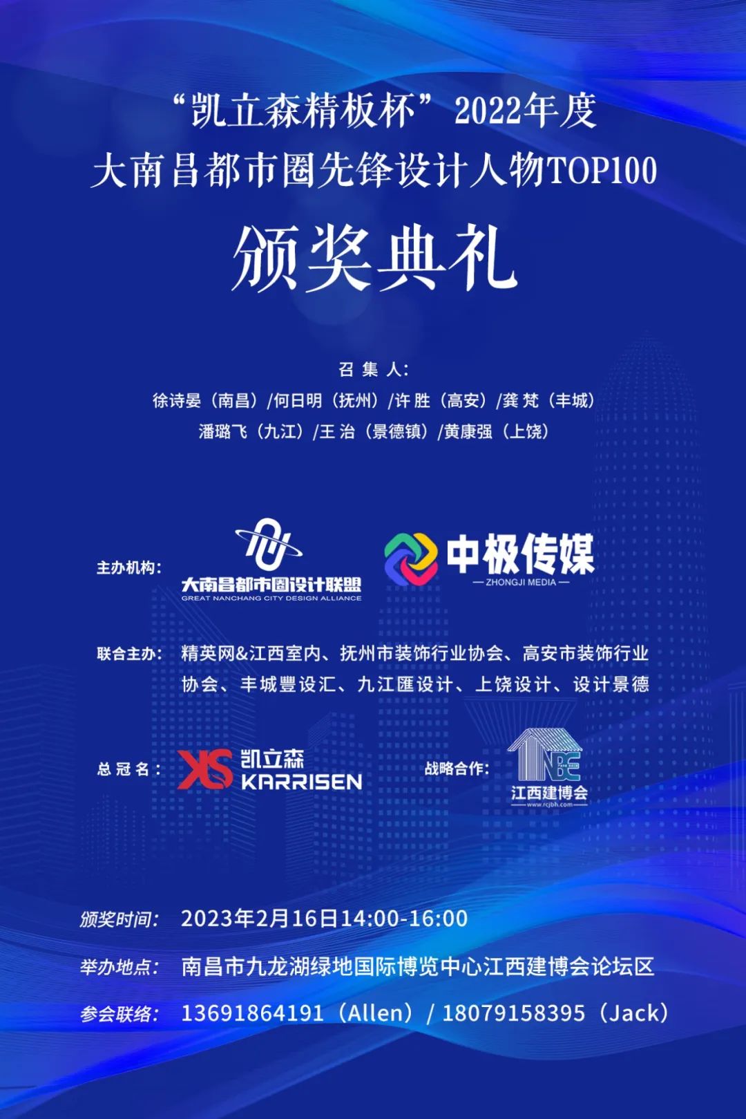 在大南昌都市圈构建布局的大发展之下,设计产业也将迎来区域融合的大发展,设计师的互动、交流和合作将大大加强,对于提升大南昌都市圈的城市、建筑美学和室内设计水平具有战略性意义。为此,2021年,中极传媒作为设计专业媒体率先创始发起成立“大南昌都市圈设计联盟”,得到了精英网&江西室内、抚州市装饰行业协会、高安市装饰行业协会、丰城豐设会、九江匯设计、上饶设计、设计景德等七城平台积极响应,并确定联合发起“大南昌都市圈设计联盟”,同时确定每年举行一届“大南昌都市圈先锋设计人物TOP100”榜单评选,在大南昌都市圈区域内每年选出100名先锋设计师给予表彰。2021年度首届“大南昌都市圈先锋设计人物TOP100”颁奖盛典于2022年成功举办,“凯立森精板杯”2022年度大南昌都市圈先锋设计人物TOP100颁奖盛典将在2023年2月16日下午14:00江西建博会论坛区隆重举行!在过去的一年,哪100名优秀设计师能够获此殊荣呢?我们现场揭晓!