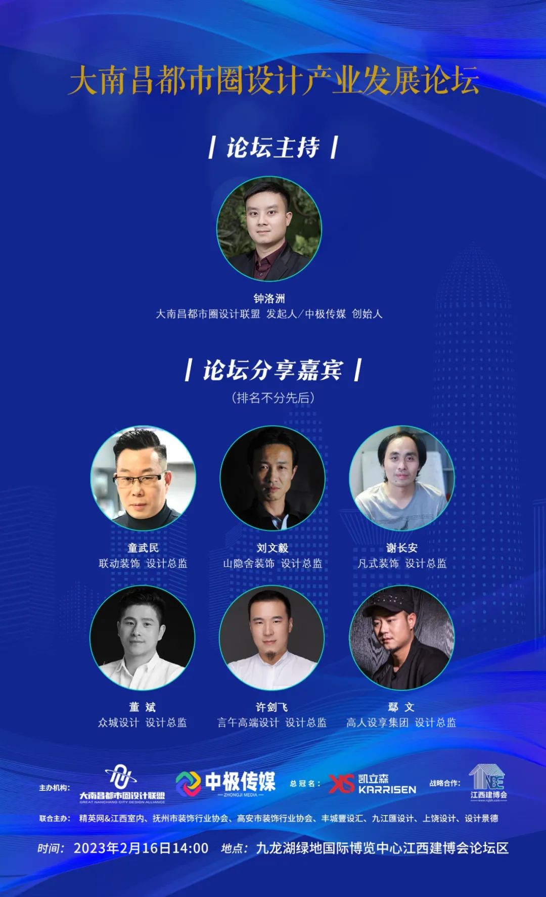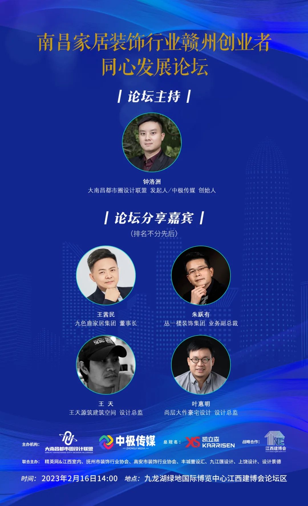 其中之二,南昌家居装饰行业赣州创业者同心发展展论坛,将邀请赣州籍行业优秀企业家、创业者代表九色鹿家居集团董事长王茜民、丛一楼装饰集团业务副总裁朱跃有、王天源筑建筑空间设计总监王天、尚层大作豪宅设计机构设计总监叶惠明进行分享,他们在异乡创业有什么成功奥秘,如何抱团?值得聆听。两场论坛,大南昌都市圈设计联盟发起人、中极传媒创始人钟洛洲将担任主持。2022年度大南昌都市圈先锋设计人物TOP100颁奖盛典特别感谢世界500强北新木业旗下凯立森精板冠名支持。好板材,好生活,相信品牌的力量,相信凯立森。同时,感谢江西建博会的鼎力战略支持,共享全省数万人的展会盛典!-THE END-