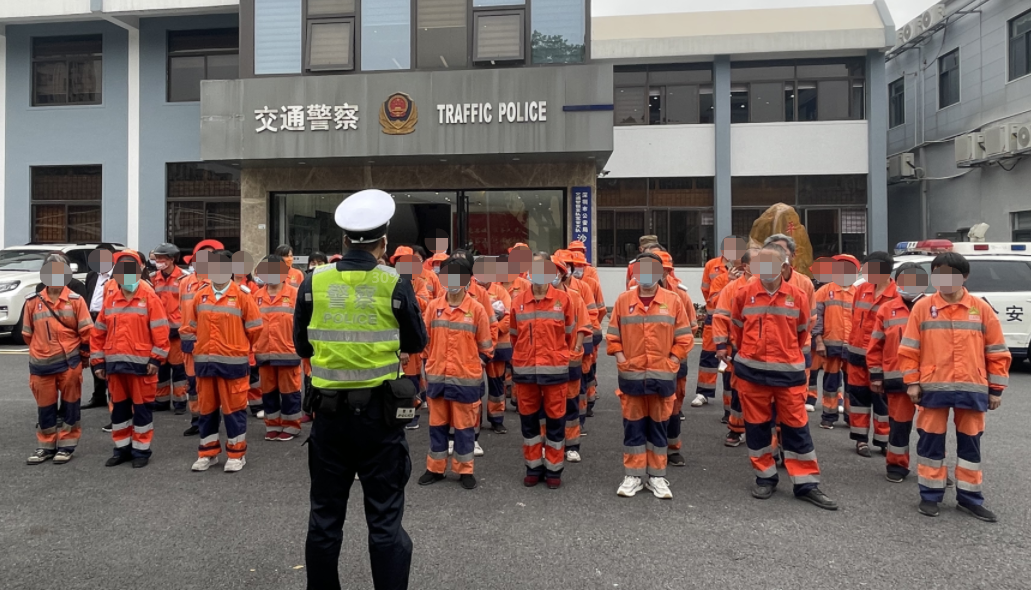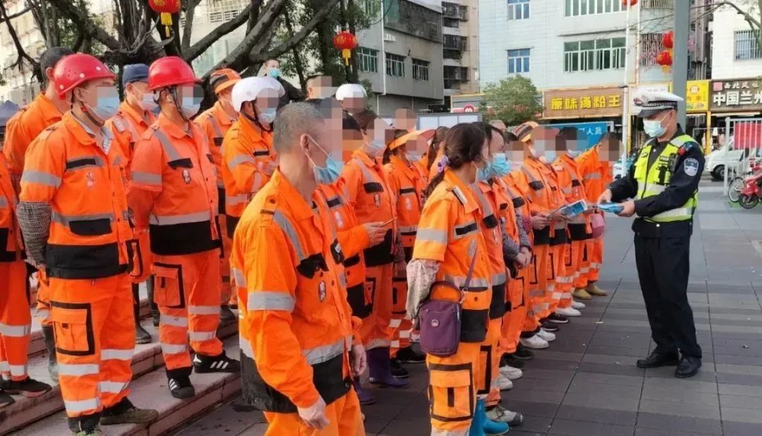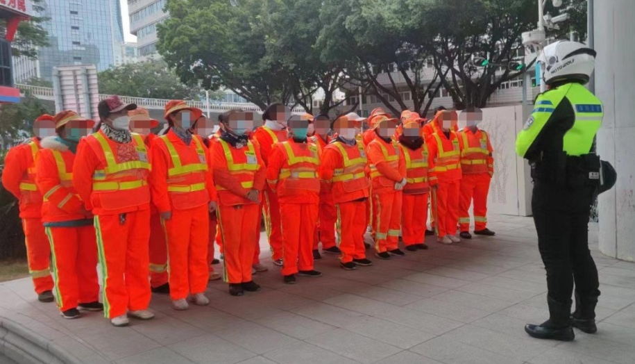 2023年1月13日,深圳交警在塘尾社区对环卫工人进行警示宣传教育活动。