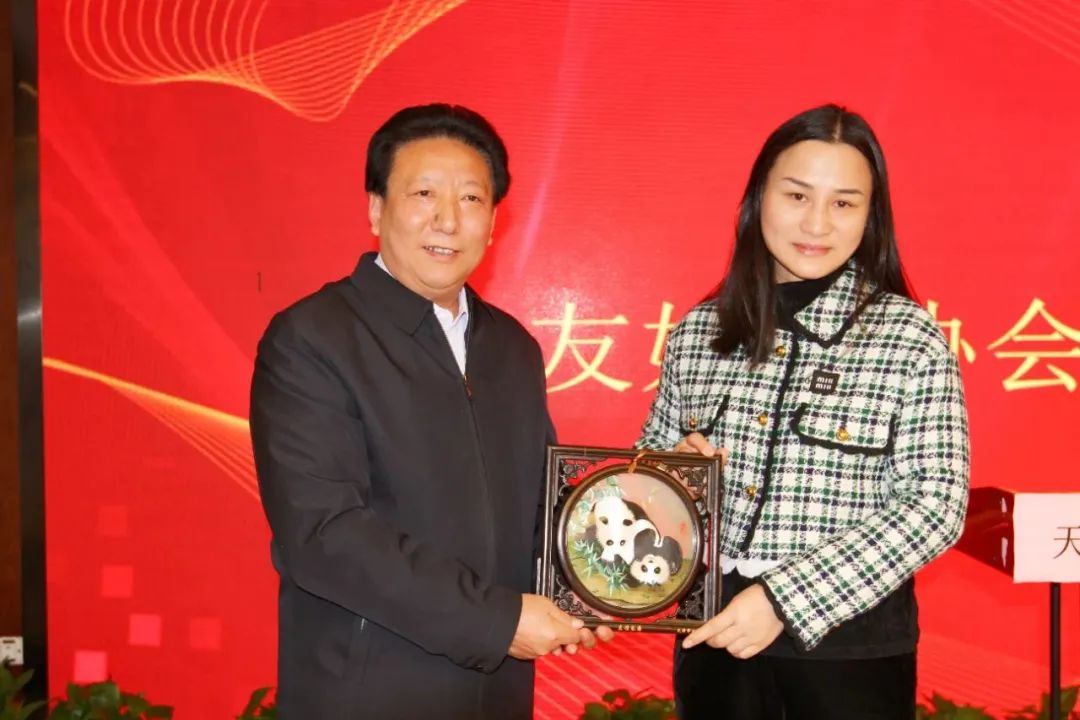 本次受邀参会的异地商协会会长、秘书长也带来了他们对天津市江西商会的祝福。天津市四川商会秘书长管金银代表四川商会赠送了一幅象征“友谊”的蜀绣——“大熊猫”;天津市重庆商会秘书长汤尚罗携中国书法家协会李强老师向江西商会赠送墨宝“正道”,希望天津市江西商会越办越好。会长王辉中、执行会长刘亚飞上台接受了馈赠,并代表江西商会向他们表达衷心的感谢。