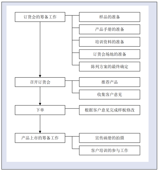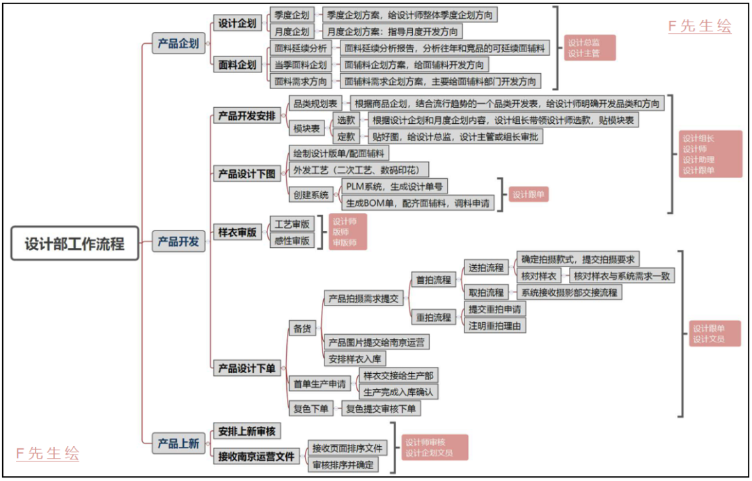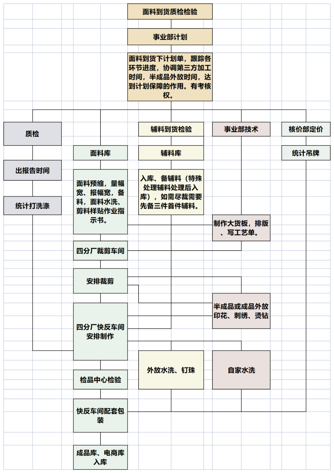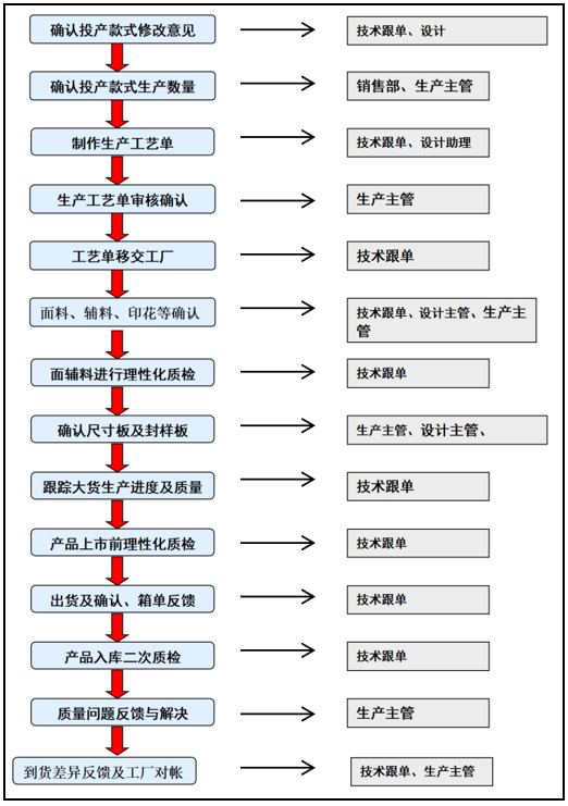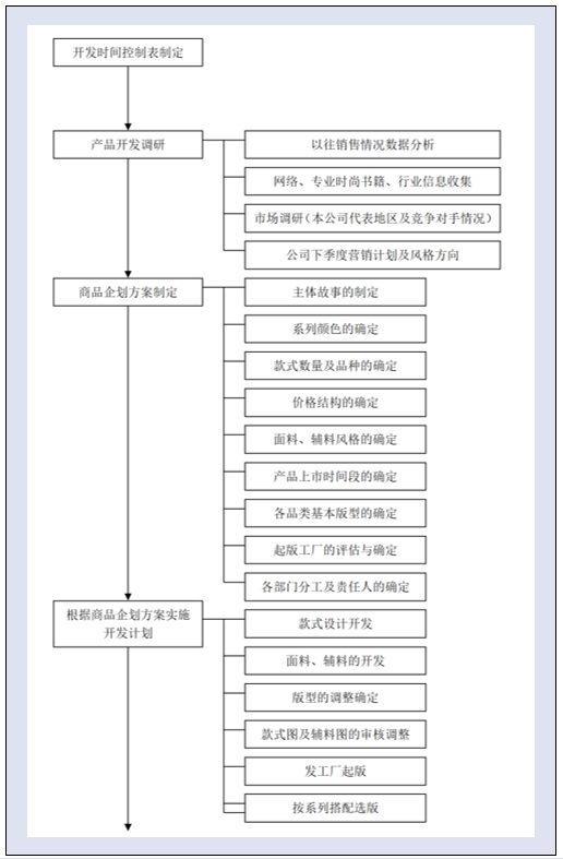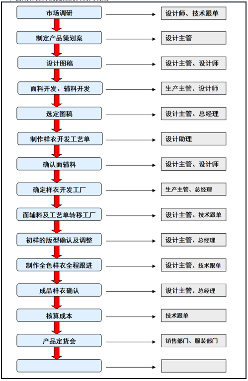 这一部分由服装厂完成,面辅料采购,质检,裁剪,缝纫,后整等等,工序非常多。至此,新品开发就算完成了。接下来就是销售的事情了。所以,新品开发一般至少要提前半年到一年开始准备。主要是要考虑大货的生产周期,要保证开发的新品能按时上市,服装就是要跟时间赛跑,过了当季流行,你的衣服就只是衣服了。商品部或者买手提供市场调研报告、历史商品分析数据、及新一季节的商品企划。设计部根据买手提供的一系列方向性商品企划,及流行趋势调研报告开发新一季节商品的设计主题及开发方向,并与买手、销售部(如有)共同确定该设计方向。根据各相关部门共同确认的本季产品开发方向及商品计划,设计部开始开发工作。具体的工作包括开发面料、辅料、寻找设计灵感来源,制定新季产品开发报告。按产品开发方向出设计稿初稿,包括款式图、颜色、面料、印花图案说明等要素。设计稿通常会经过2~3次与买手及销售部的讨论后最后确认一份终稿。在这个过程中,设计师同时会与样衣开发部门(或者跟单)配合开始样衣制作。有部分样衣已经开发出来,设计部与买手会再次碰头审核样衣并提出相关的修改意见。