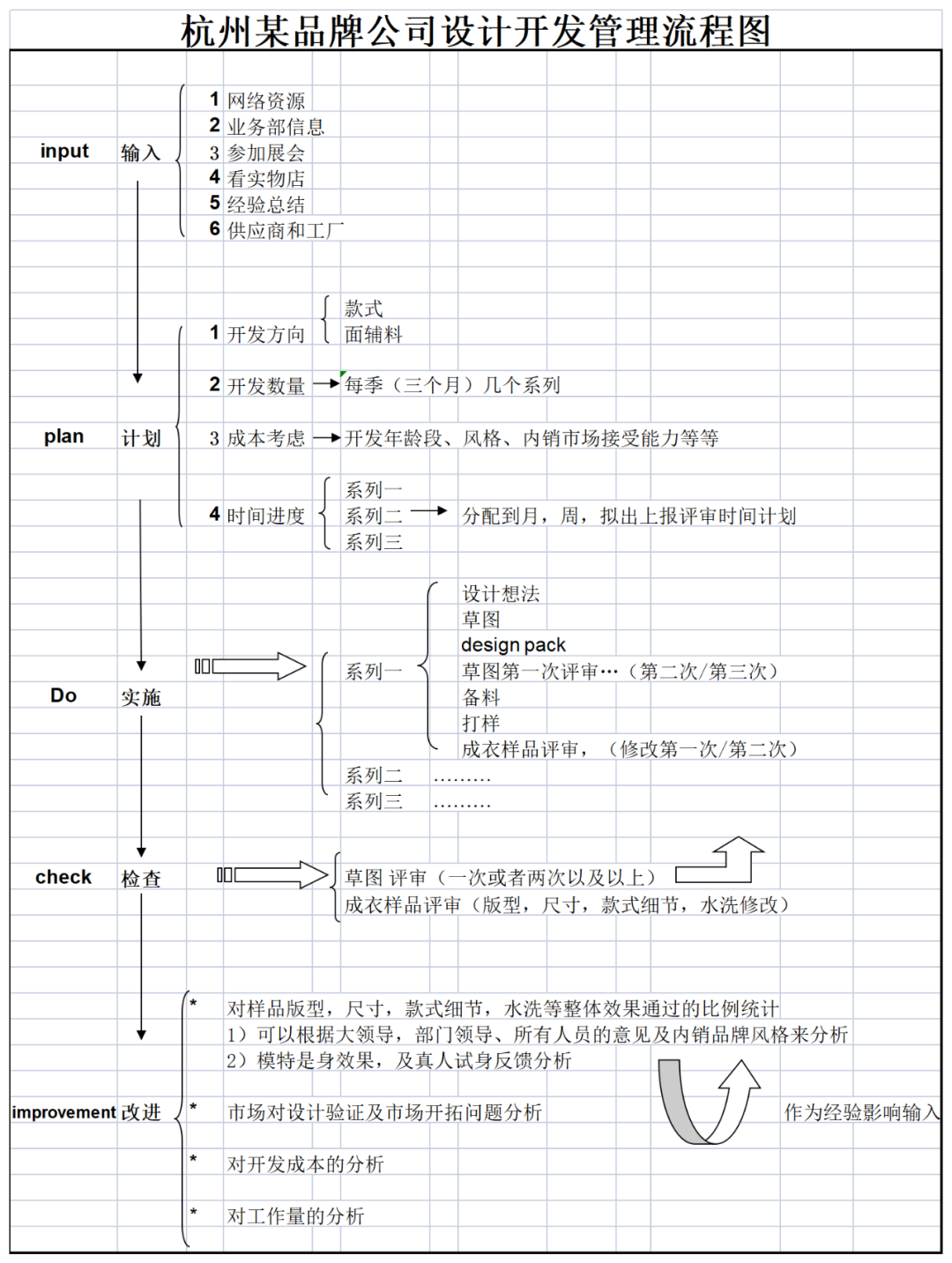 为你整理了8份国内品牌服装公司的真实开发流程。可以把不同类型产品开发模式做横向比较,供大家参考。设计总监根据拿到的新一季流行趋势报告,参考前面在秀场、视频、样衣、企划等内容,将整季度或按品类或按波段分解到各个设计师手上。设计师开始参加市调。市调重点是海选面料和辅料(价格控制是重点)、构思设计点,找面料、辅料供应商对设计点做前期打样实验。设计师开始出设计图稿(因为专业的原因,这里跳过手绘稿,直接到coreldraw稿出来)。设计稿信息包括但不限于廓形、设计点、上身效果、使用面料、使用辅料等。设计图稿转交技术部版师,设计师和版师沟通,讲出自己的想法。版师根据自己的理解和设计师的沟通将设计稿做成纸质样板,过程中设计师与版师随时沟通。纸质样板出来后,设计助理根据设计稿上面标注的面料辅料开始配物料(版师会标注用量),之后交样衣房做第一件样衣。公司有自己约定俗成的用线型号及车缝方式,如果设计稿上面没有特殊标注,一切就按约定俗成的来。第一件成衣出来,设计师按照自己的想法规划手工的装订标准,讲解给手工阿姨,手工阿姨按照讲解或者画的图稿订手工(像珠啊钻啊这些)。手工完成,第一件样衣就出来了。样衣出来后,公司的试衣模特开始试衣,看上身效果。第一次审样的时候设计师、版师、样衣制作师傅全程跟进,商讨修改细节。完事之后版师改纸样,样衣师傅重新做第二件。这样重复,直到衣服完全达到了大家的期望为止。成衣交技术部工艺师,工艺师开始核对工艺,有批量生产风险的提出来做风险评估,没有的开始放码(从标准M码放到S/M/L/XL/XXL码)写工艺单(包括但不限于设计稿、款号、设计师、版师、面料、辅料、工艺标准、整烫标准、挂牌标准、洗涤标准、包装标准、运输标准等)。同时排大货唛架,为批量生产做准备。接下来是整季样衣评审,需要设计、技术、营销、生产及一些客户一起参与。选好的,改一般的,淘汰差的。直到达到商品企划要求的数量。然后是准备订货会。设计师开始写单款FAB、搭配FAB等。并选出一定的搭配款(包括但不限于上下搭、内外搭、搭饰品等)、排列走秀顺序在订货会走秀时用。搭配款和单款会在订货会之前拉出去拍商品图片,印刷订货手册。同时设计师协助陈列部做橱窗出模等方案。会涉及到公司以及品牌的整体商业战略,包括设计企划和商品企划。商品企划是指季节占比,品类构成,款色数占比,上市波段等等,需要大量市调和销售数据支撑。设计企划是指研究各大秀场的流行趋势(颜色,风格,主题,面料,工艺)等等,确定符合自身品牌定位的潮流趋势进行整体规划。