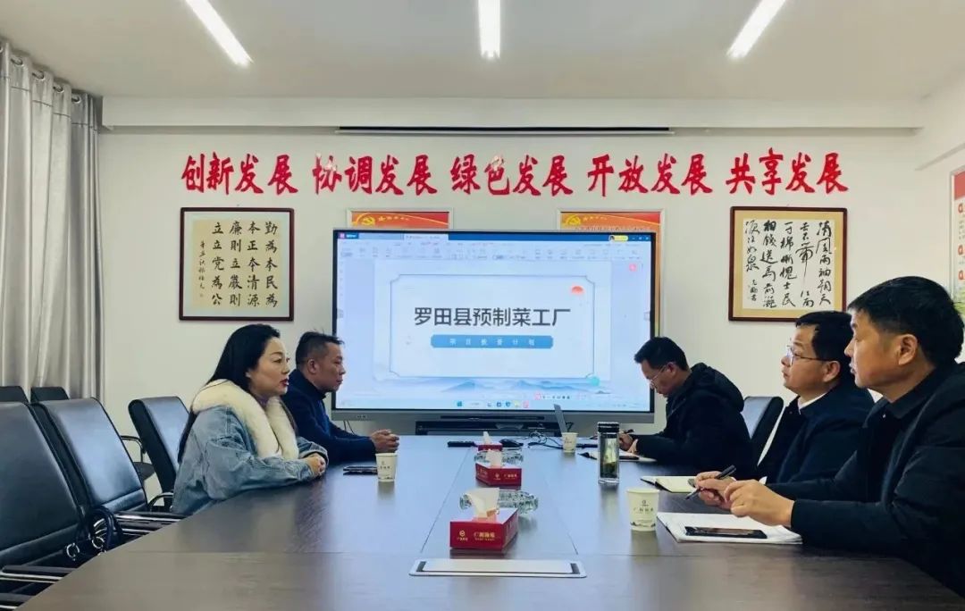 集团董事长杨天平、农投科技公司总经理陈初明、副总经理王焱与招商团队洽谈绿润食品厂合作事宜。