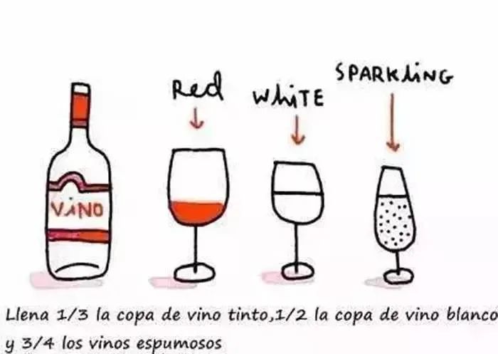 葡萄酒倒满1/3,白酒倒满1/2,香槟倒满3/4