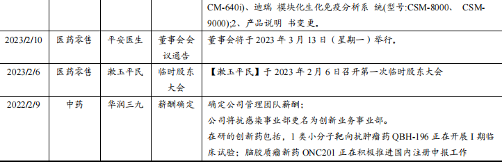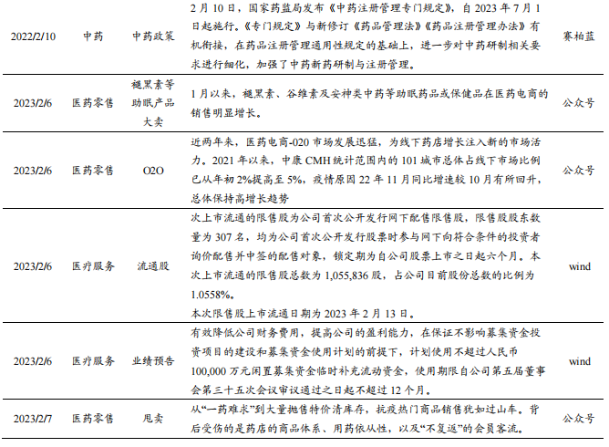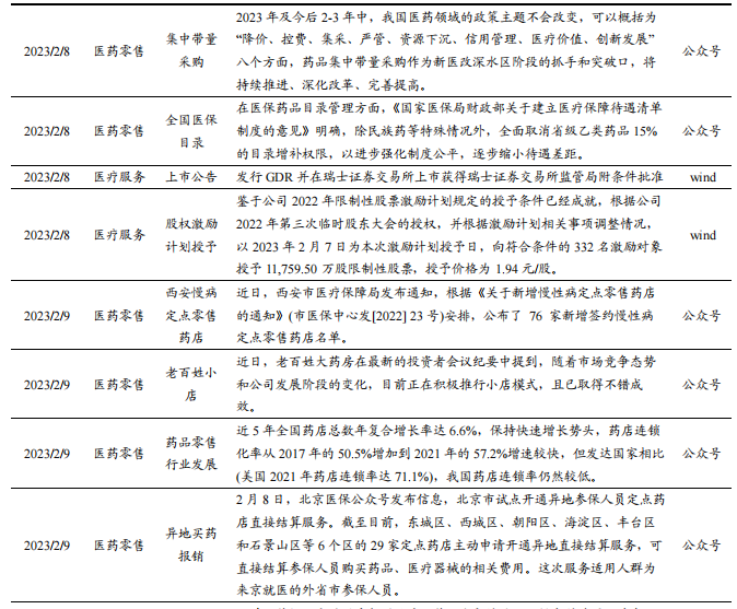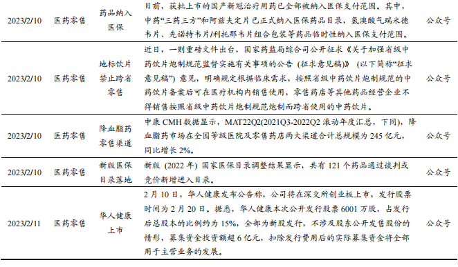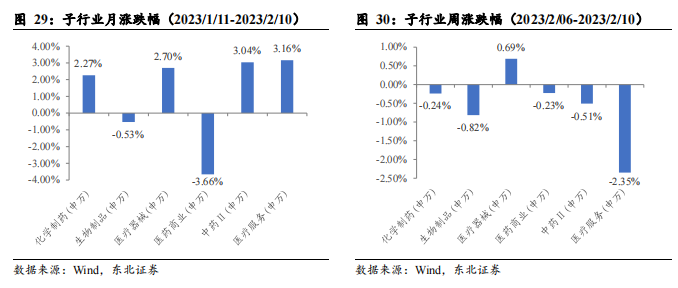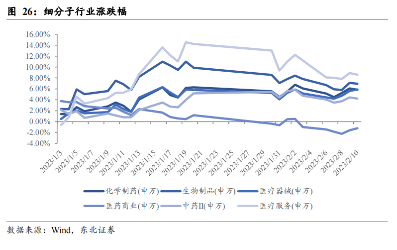 2023 年以来医药生物行业走势呈现上升趋势,化学制药、生物制品、医疗器械、中药Ⅱ、医疗服务细分板块变动趋势相近。截止 2023 年 2 月 10 日,细分行业中,医疗服务板块涨幅最大,为 8.60%。医药商业板块跌幅-1.20%。