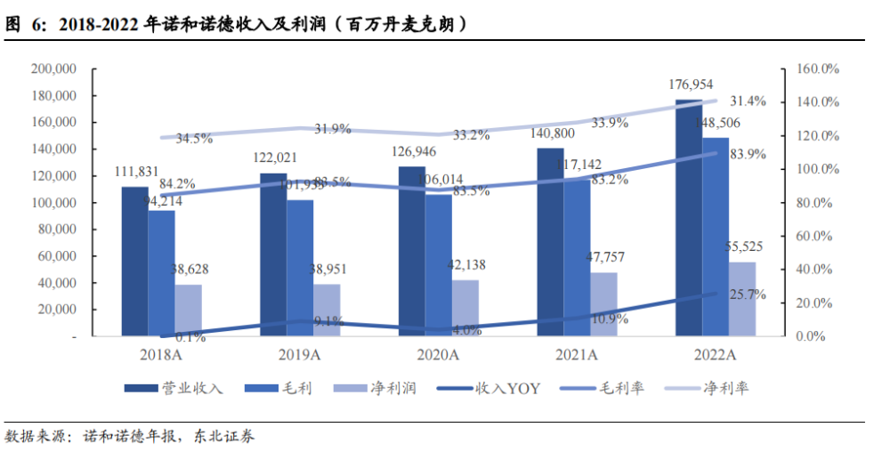 诺和诺德收入增速大幅提升,毛利率及净利率持续稳定。诺和诺德 2022 年实现收入 1769.54 亿丹麦克朗,同比增长 25.7%。其中,糖尿病和肥胖护理产品收入占比88.4%,尤其是 GLP-1 类药物收入占比高达 47.1%;罕见病产品收入占比 11.6%。2022 年实现毛利润 1485.06 亿丹麦克朗,近几年毛利率持续稳定保持在 83%。2022年实现净利润 555.25 亿丹麦克朗,同比 2021 年的 477.47 亿丹麦克朗,增长 16.3%;近五年净利率超过 30%。