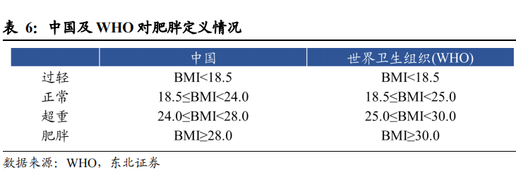 全球肥胖人数不断增加,减重需求更加凸显。肥胖是一种多因素引起的代谢障碍疾病,与多种慢性非传染性疾病相关,被世界卫生组织列为导致疾病负担的六大危险因素之一。肥胖症是指体内贮积的脂肪量超过理想体重 20%以上,其发生机制是因为能量摄入超过能量消耗,导致体内脂肪过度蓄积和体重超常。国际通用诊断肥胖标准是体质指数(BMI),各国肥胖范围有所不同。在中国,BMI 大于等于 28 为肥胖。