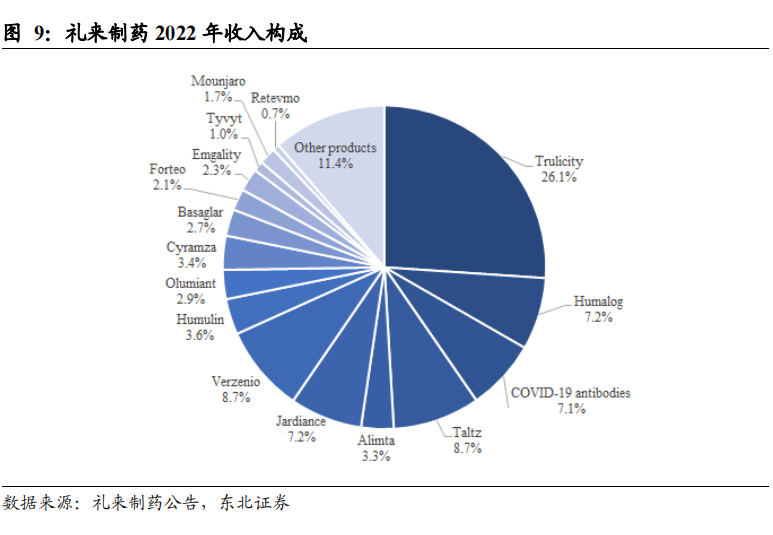 礼来制药净利率增速由负转正,成本下行。2022 年礼来制药实现收入 285.41 亿美元,成本由 2021 年的 73.13 亿美元下降至 2022 年的 66.3 亿美元,下降幅度明显。2022 年实现净利润 62.45 亿元,净利润增速从 2020 年、2021 年的-25.5%、-9.9%由负转正,2022年净利润增速达到11.9%,业务发展良好。其用于治疗糖尿病的Trulicity、Humalog、Jardiance、Humulin、Basaglar、Mounjaro 药物占据收入的比例为 48.5%,其中 GLP-1 类药物占比达 27.8%。GLP-1 类药物仍是礼来制药市场在糖尿病市场竞争力的亮点。