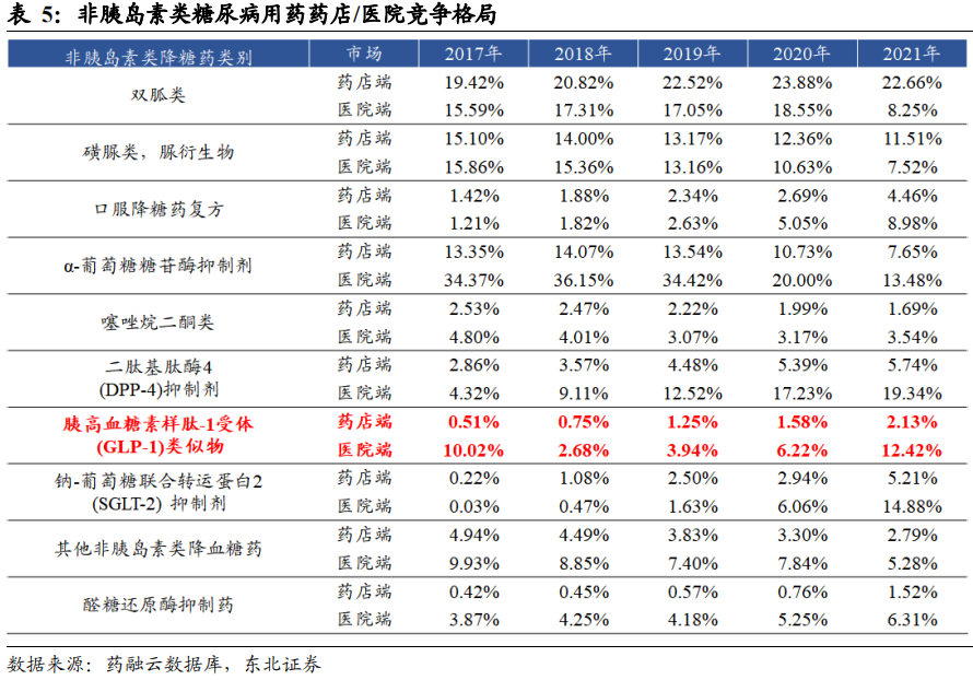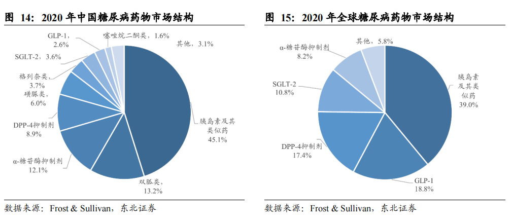 糖尿病类市场用药,心血管安全性药物地位显著上升。糖尿病的病因和发病机理目前尚未得到完全认识,目前全球共研发了 9 类糖尿病治疗药物。国内糖尿病化药医药市场主要分为胰岛素与其同系物、非胰岛素类降糖药,两者几乎占据了全部市场。在医院市场,DPP-4、SGLT-2 和 GLP-1 占比分别为 19.34%、14.88%和 12.42%,占据了糖尿病药物市场的前三,其他传统口服药占比约为 53.36%。在我国药店零售市场,DPP-4、GLP-1 和 SGLT-2 占比不大,但是呈现增长态势。从中国糖尿病防治指南(2020 版)来看,二甲双胍是治疗糖尿病的基石药物,联合用药已成为重要治疗手段,尤其是对于有心血管受益的 GLP-1 受体激动剂和 SGLT-2 抑制剂等药物的用药地位有所提升。
