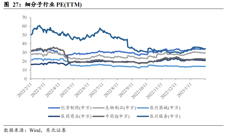 医药生物板块整体估值处于历史低位,估值回调幅度较大。截至目前为止,医疗服务市盈率最高,为 34.31 倍,医疗器械市盈率最低,为 14.22 倍。