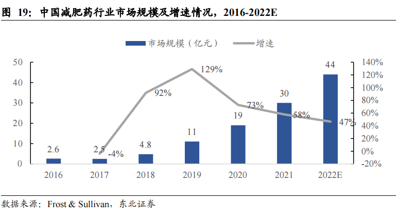 截止目前,FDA 共批准了 5 款药物用于治疗超重和肥胖,分别为奥利司他(Xenical,Alli)、芬特明托吡酯(Qsymia)、纳曲酮安非他酮(Contrave)、利拉鲁肽(Saxenda)和司美格鲁肽(Wegovy),其中利拉鲁肽与司美格鲁肽为 GLP-1RA 类似物,也是仅有两种获批减重适应症的 GLP-1RA。国内市场目前主要应用奥利司他治疗肥胖及超重,有明确治疗效果的新型药物将解决巨大临床需求。据 Frost & Sullivan 报告,2019年中国减肥药市场规模为 11 亿元,2022 年预计达到 44 亿元,增速迅猛。