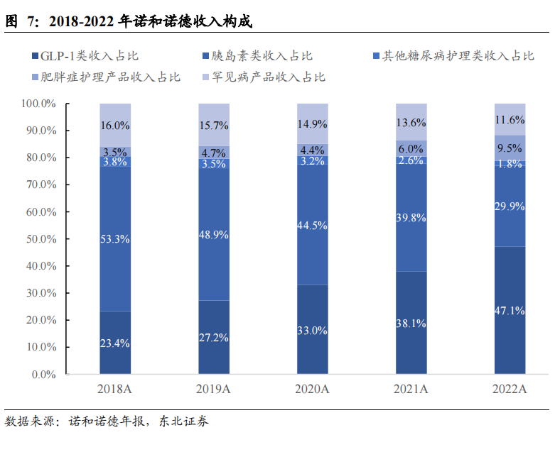 GLP-1 类产品收入占比持续攀升,超过胰岛素类药物占比。诺和诺德 2022 年 GLP-1 类产品 2022 年收入为 833.71 亿丹麦克朗,相较于 2021 年的 535.97 亿丹麦克朗,收入增速高达 55.6%。GLP-1 类产品收入占比从 2018 年的 23.4%上升至 2022 年的47.1%,成为诺和诺德收入的中流砥柱。胰岛素类药物 2021 年实现收入 560.06 亿丹麦克朗,2022 年降至 529.52 亿丹麦克朗,收入占比也从 39.8%下降至 29.9%。2022年 GLP-1 类产品的放量带来了整体营业收入的大幅增长。