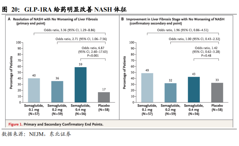 在美国肝病研究协会(AASLD)年会 The liver meeting 会议上,诺和诺德(NovoNordisk)汇报了其 GLP-1 受体激动剂 Semaglutide 的阳性结果,Semaglutide 显著减轻了非酒精性脂肪性肝炎(NASH)患者的肝脏脂肪变性和肝损伤,但并未显著改善纤维化严重程度。相关研究结果也于 2020 年 11 月 13 日发表在 NEJM 杂志上。结果显示 Semaglutide 治疗 230 名患者,达到了 NASH 缓解的主要终点,使用Semaglutide(所有剂量组)的缓解比率显着高于安慰剂组(40.4%比 17.2%)。