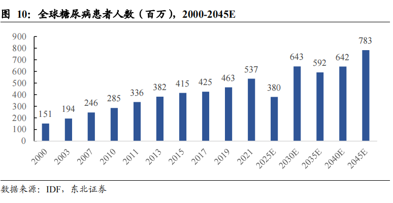 糖尿病是因胰岛素绝对或相对分泌不足和(或)胰岛素利用障碍引起的碳水化合物、蛋白质、脂肪代谢紊乱性疾病,以高血糖为主要标志。据公开数据统计,全球范围内 II 型糖尿病的患病率呈上升趋势,世界糖尿病患者总数伴随上升。据 WHO 报告,2021 年全球共 79 亿人,其中糖尿病发病人数为 5.37 亿,占据全球总人数的 6.8%,糖尿病患者基数庞大。据 2021 年国际糖尿病联盟(IDF)《糖尿病地图集第 10 版》数据显示,2021 年全球成年糖尿病患者人数达到 5.37 亿,相较于 2019 年糖尿病患者增加了 7400 万,增幅达 16%,突显出全球糖尿病患病率的快速增长。据 IDF 预测,2030 年糖尿病人数将增至 6.42 亿,2045 年增至 7.82 亿,患者人数增长率达