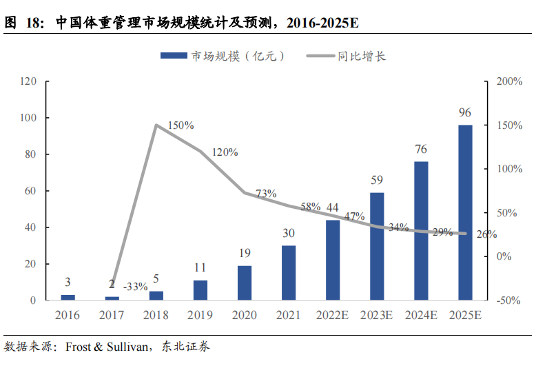 相比于手术治疗,采用药物治疗无手术并发症风险,副作用较少,患者接受度高。据 Frost & Sullivan 数据显示,2021 年中国体重管理市场规模达 30 亿元,较 2020 年增加了 11 亿元,同比增长 57.89%,随着国民对体重健康管理意识的提高,体重管理需求将进一步增长,预计 2025 年中国体重管理市场规模将达到 96 亿元。