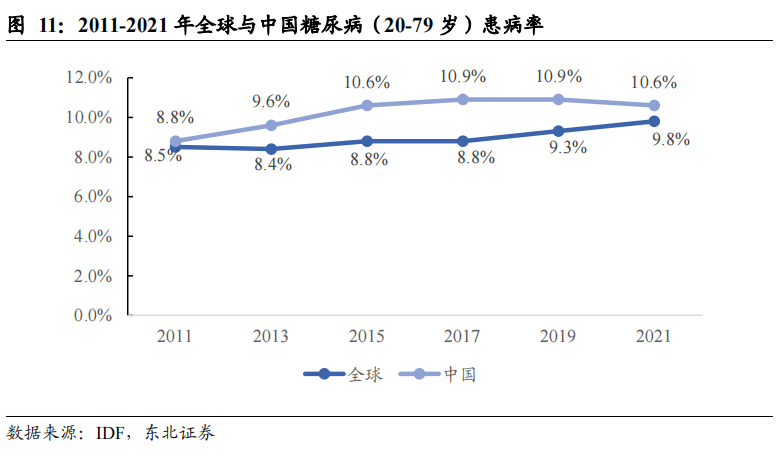 中国糖尿病治疗市场空间较大,用药种类更为多样化。据 IDF 数据披露,中国糖尿病患者人数从 2011 年的 9004 万人上升至 2021 年的 1.4 亿人,其中 II 型糖尿病患者占比 90%以上。据 IDF 预测,2045 年我国糖尿病患病人数将上升至 1.74 亿人。随着生活水平逐步提升,糖尿病患病率明显提升。2021 年,全球糖尿病患者(20-79岁)患病率为 9.8%,中国患病率达 10.6%,高于全球平均水平。