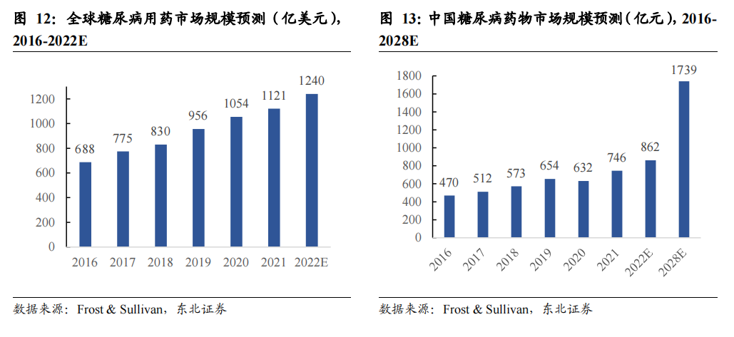 据统计,2016 年全球糖尿病市场规模 688 亿美元,2022 年将达到 1240 亿美元。国内糖尿病患者基数较大,市场规模从 2016 年的 470 亿元上升至 2021 年的 746 亿元,五年期增速达 58.7%。糖尿病药物市场将增至 2028 年的人民币 173 亿元,复合年增长率为 11.8%。
