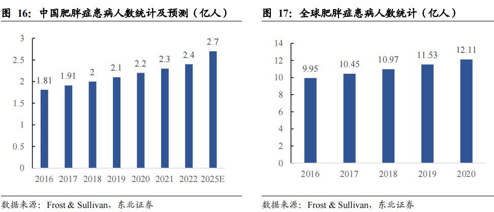 肥胖症患病人数持续增长,治疗市场空间广阔。Frost & Sullivan 数据显示,2022 年中国肥胖症人数为 2.4 亿,较 2021 年增加了 0.1 亿人,预计到 2025 年人数将达到2.7 亿。2020 年全球肥胖症患病人数达 12.11 亿人,中国占比达到 18.2%,是世界上肥胖人数最多的国家。肥胖威胁着人体健康,同时也是 II 型糖尿病、高血压、高血脂、脂肪肝、多囊卵巢综合症及心脑血管疾病等多种慢性疾病的潜在诱因。肥胖人群逐年增加,庞大的受众群体将带来广阔的市场空间。