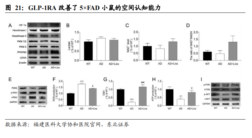 阿尔茨海默病(Alzheimer's disease,AD)是一种中枢神经系统退行性疾病。AD 病理现象复杂,AD 患者普遍存在脑神经细胞外大量 B-淀粉样蛋白(B-amyloid,AB)沉积形成的老年斑、tau 蛋白异常磷酸化形成的细胞内神经原纤维缠结(neurofibrilarytangles,NFTs)、神经元丢失、神经营养不良、突触丢失等病理现象。2021 年福建医科大学协和医院探讨了 GLP-1 在 AD 中的糖酵解调节作用,并揭示其神经保护机制。研究发现 GLP-1 通过增强有氧糖酵解和减少氧化磷酸化作用改善 5×FAD 小鼠的认知功能水平和大脑中的氧化应激,并且可缓解 Aβ 诱导的星形胶质细胞糖酵解下降,从而导致 OXPHOS 水平下降以及活性氧(ROS)的产生。其机制涉及 GLP-1 激活 PI3K/Akt 通路。该研究揭示了 GLP-1 调节星形细胞糖酵解的能力,提供了 GLP-1 在 AD 中的神经保护机制并为 AD 的能量调节治疗提供了可行性的支持。