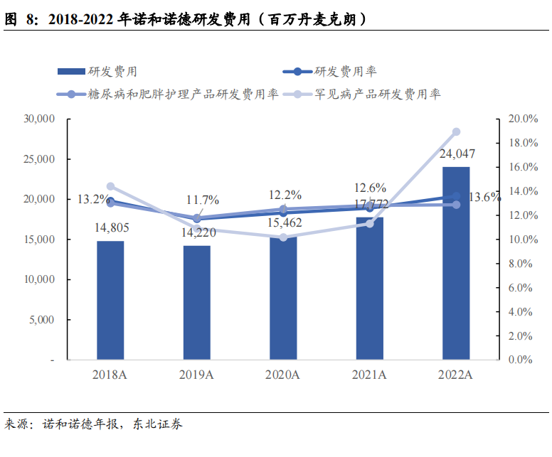 研发费用投入逐年增加,费用率保持平稳。据诺和诺德 2022 年财报披露,糖尿病及肥胖症的研发投入主要集中在 GLP-1 类产品上,主要采用基于先进的蛋白质化学和蛋白质工程的生物技术方法。罕见病产品的研发费用率也在逐年提高,仍专注于血友病及其他罕见的血液疾病和人类生长激素的研发。对其他新领域也有所涉猎,助力多种适应症的研发,如 NASH、阿尔兹海默症、慢性肾病。同时在研究中进一步利用新的细胞治疗、RNAi 治疗研究技术平台。