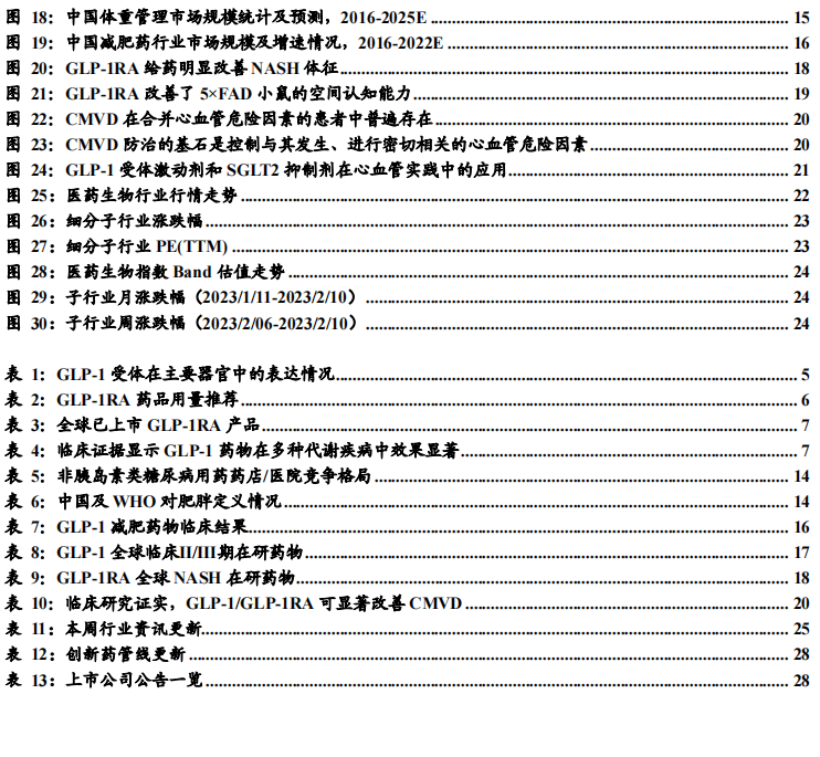 2021 年 9 月获得受理,并于 2022 年 8 月完成发补研究资料递交;肥胖或超重适应症的上市许可申请于 2022 年 7 月获得受理,预计 2023 年底前获批上市,有望成为国内首个获批减肥适应症的 GLP-1 受体激动剂。三款产品均为 GLP-1 受体激动剂,通过激动 GLP-1 受体以葡萄糖浓度依赖的方式增强胰岛素分泌、抑制胰高糖素分泌而发挥降低血糖的作用,因而不显著增加低血糖风险。同时,GLP-1 受体激动剂可通过延缓胃排空、中枢性的食欲抑制降低体重,多项研究表明 GLP-1 受体激动剂对降低心血管主要事件风险有显著作用。