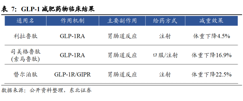 GLP-1 为当前减肥药黄金靶点,GLP-1R 药物迭代优化。胰高血糖素样肽-1(GLP-1)分泌不足是导致肥胖的生理学机制之一。由于患者需要长期服药,减重药物的长期安全性为未来研究的重点。GLP-1 在减重临床研究中显示出了更好的安全性,已成为减重药物领域的新突破。当前 GLP-1RA 正成为肥胖症的主流开发方向,且减重数据伴随着产品迭代持续优化。诺和诺德开发的司美格鲁肽治疗效果优于同类产品利拉鲁肽,礼来 GLP-1R/GIPR 双靶点激动剂替尔泊肽可达到体重降幅 22.5%的疗效,表现出较大临床潜力。目前国内尚无 GLP-1 受体激动剂减肥药上市,多款 GLP-1 受体激动剂处于临床在研阶段。
