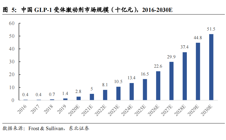 据诺和诺德统计,使用频率一周一次的司美格鲁肽、度拉糖肽等产品登陆中国市场后,国内 GLP-1 的市场迎来明显增长,2022 年全年增长率预计达到 132.5%。据 Frost& Sullivan 报告,预计 2030 年中国 GLP-1 市场规模可达 515亿元,未来市场空间广阔。国内在研产品管线丰富,随着国产仿制药及创新产品上市,GLP-1 市场仍存在较大上升空间。