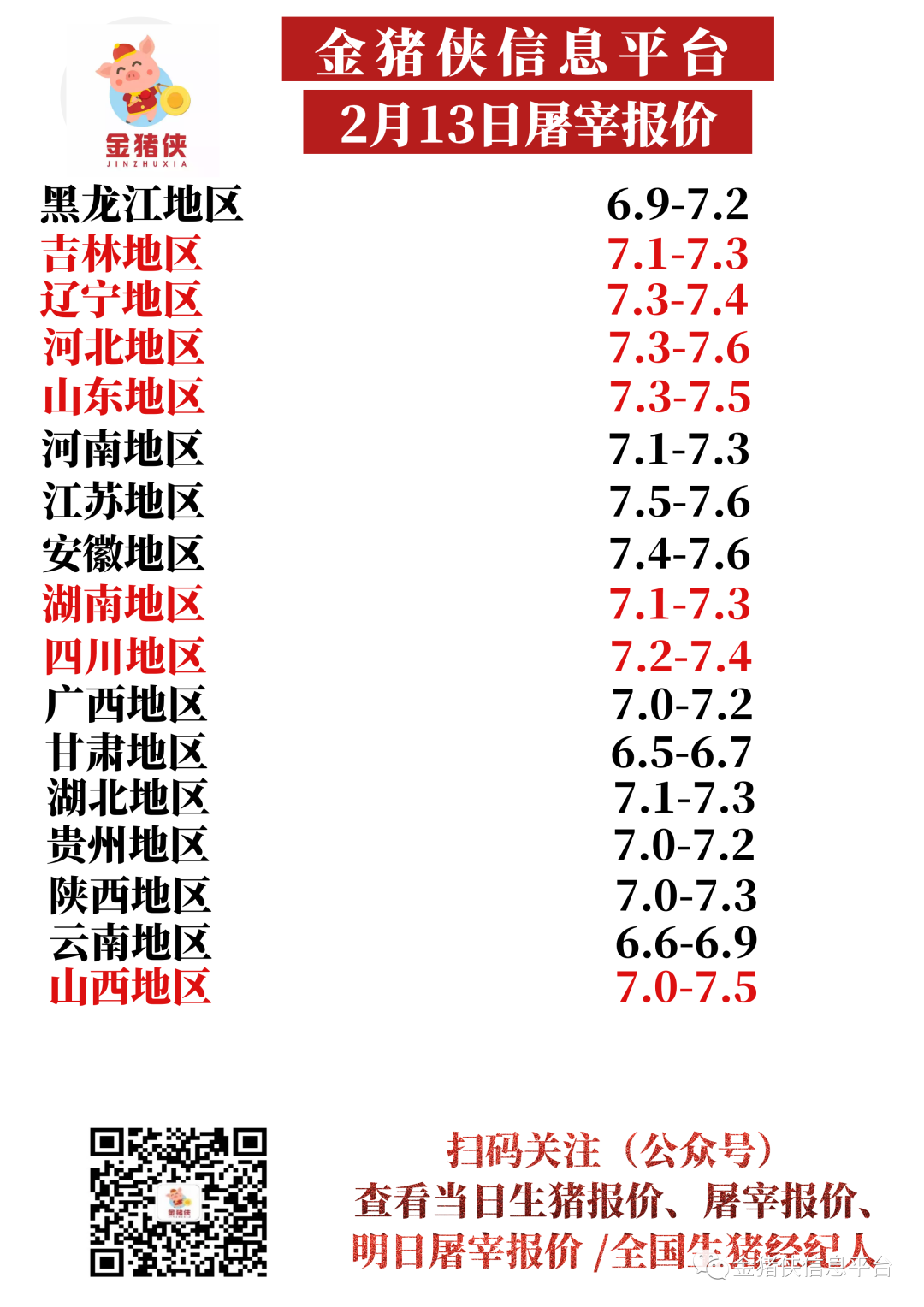 【金猪侠】2月13日屠宰企业收购价~【多地上涨】