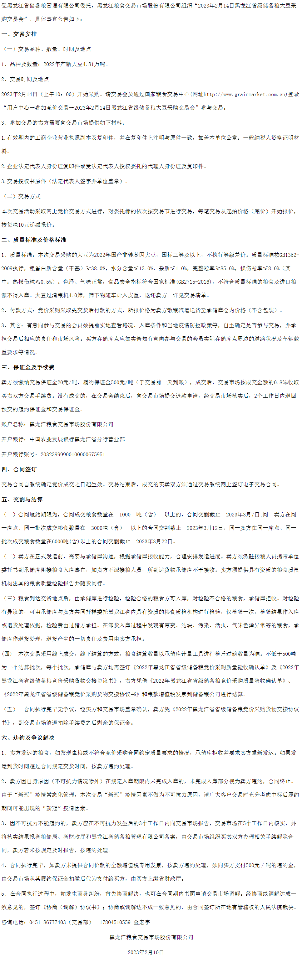 2023年2月14日黑龙江省级储备粮大豆采购交易会公告