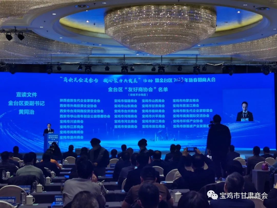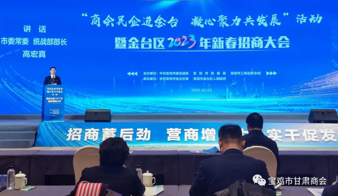 2月3日下午,由市委统战部、市招商局、市工商联共同举办的“商会民企进金台·凝心聚力共发展”活动暨金台区2023年新春招商大会在建国饭店召开。市委常委、副市长丁胜仁、市委常委、统战部部长高宏真、市人大常委会副主任陈爱民、市政协副主席张南、市政府副秘书长谢冬、市委统战部副部长、市工商联党组书记魏连忠、市工商联主席王喜平等市级领导出席会议。市委统战部、市招商局、市工商联、市侨联负责同志、市级各民主党派负责人、20名市工商联所属商会会长、20名民企负责人代表参加了会议。会议由金台区委书记、蟠龙新区党工委书记薛建恩主持。我会党支部书记段志刚企业——宝鸡当当书店作为民企代表应邀参加了会议。