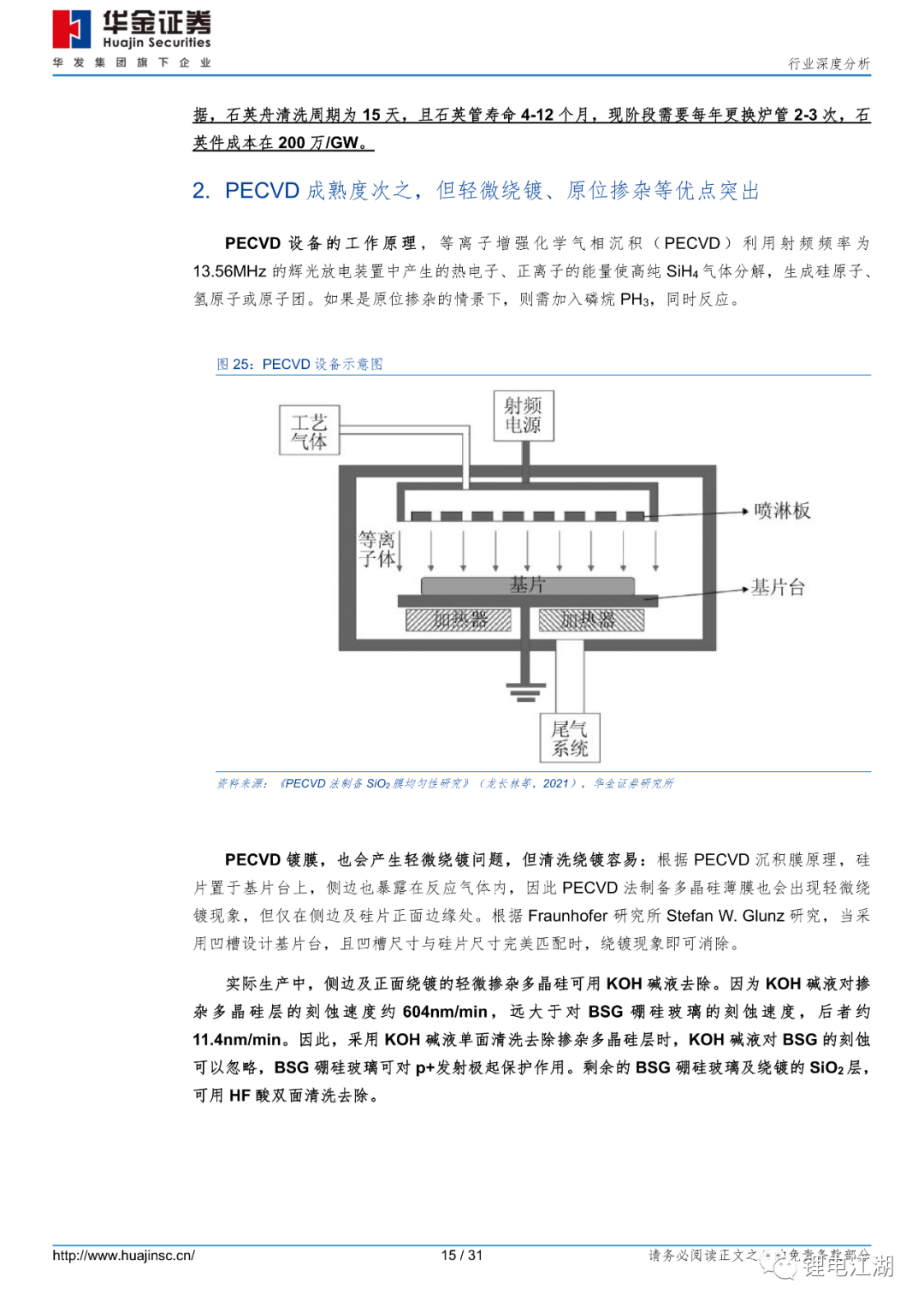 从经济性角度看,PECVD路线设备投资成本低、产能大、维护成本低、开机率高。根据皇氏集团机构调研纪录表,(1)PE路线比LP路线设备采购成本少;(2)PE路线工艺时间短,单台设备产能大,设备机台数量少,省空间,设备好布局;(3)维护成本对比:LP路线石英管寿命平均56天,石英舟寿命60天,石英件消耗162万/台/年,PE路线石英管寿命1-2年,只有正常的石墨舟消耗,LP设备的石英件消耗比PE设备费用预计多出3530万/年(5GW计);(4)设备人员配置上,LP路线估计是PE路线的一倍以上,每天在做维护换石英管,且设备利用率较低,更换石英管需要3-4小时,期间整台设备需停机。